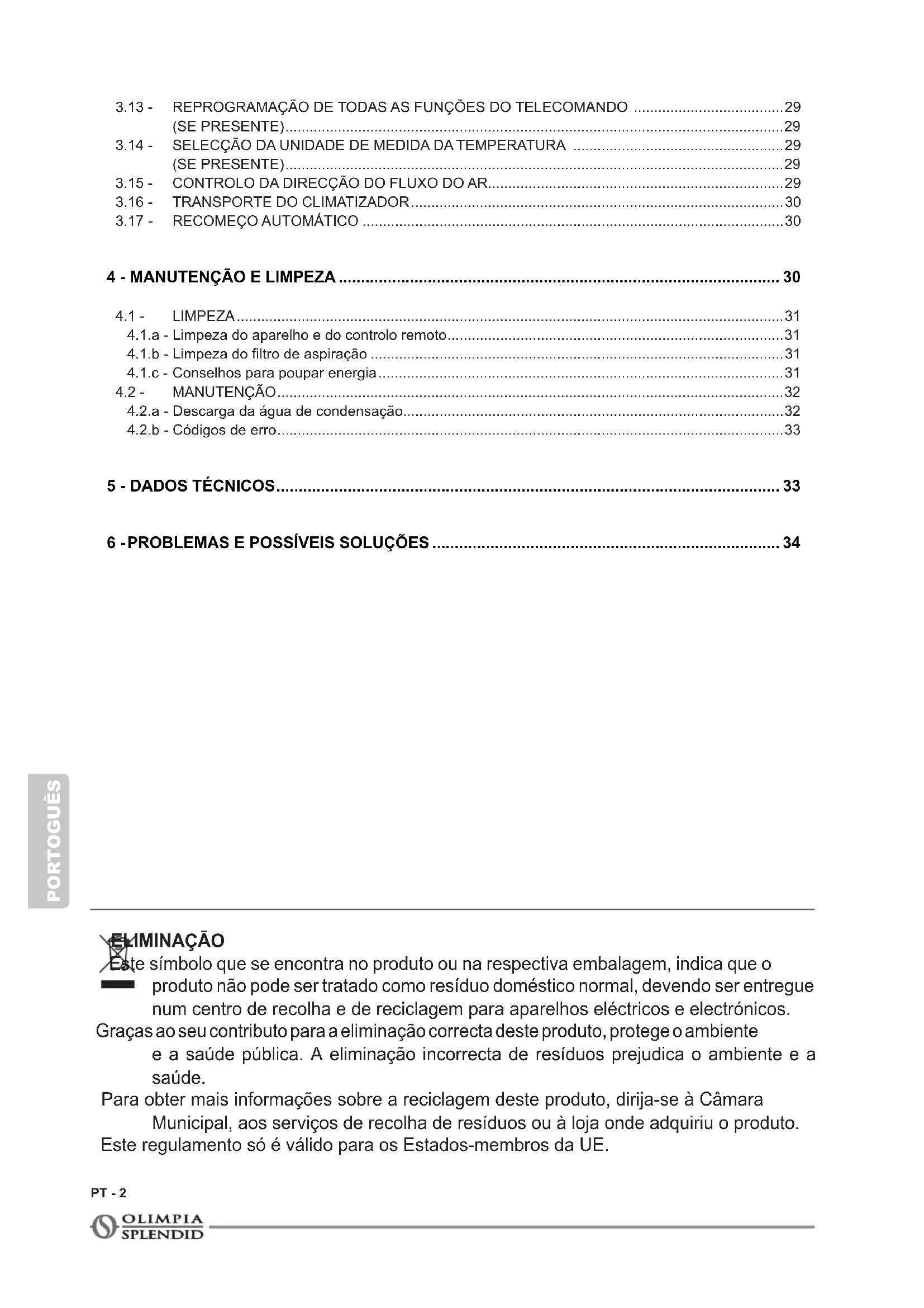 3.12.d - Programação do temporizador de desligação no painel de comandos ......................................29PORTOGUÊS PT - 2 ELIMINAÇÃO Este símbolo que se encontra no produto ou na respectiva embalagem, indica que o produto não pode ser tratado como resíduo doméstico normal, devendo ser entregue num centro de recolha e de reciclagem para aparelhos eléctricos e electrónicos. Graças ao seu contributo para a eliminação correcta deste produto, protege o ambiente e a saúde pública. A eliminação incorrecta de resíduos prejudica o ambiente e a saúde. Para obter mais informações sobre a reciclagem deste produto, dirija-se à Câmara Municipal, aos serviços de recolha de resíduos ou à loja onde adquiriu o produto. Este regulamento só é válido para os Estados-membros da UE.