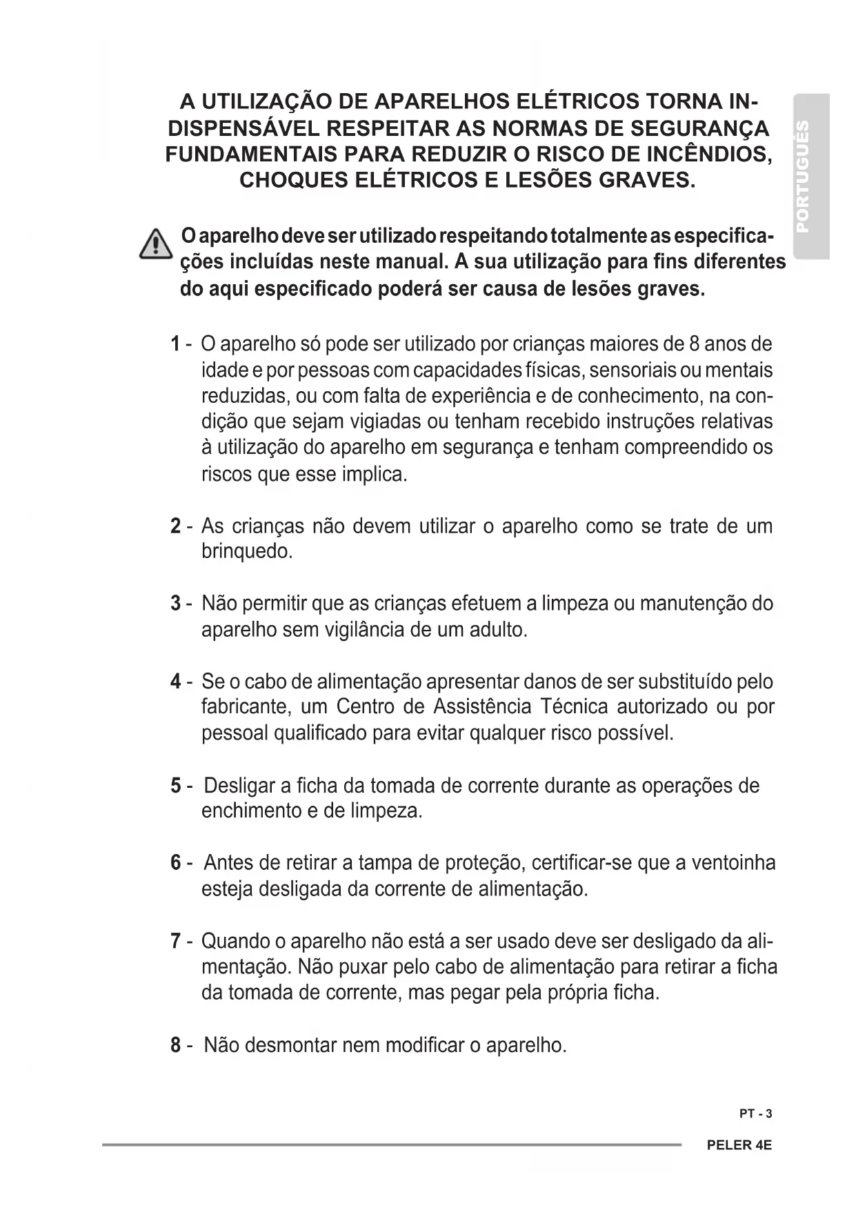 Para conocer los siguientes datos técnicos, consulte la placa de datos aplicada en el aparato.PELER 4E PORTUGUÊS PT - 3 A UTILIZAÇÃO DE APARELHOS ELÉTRICOS TORNA IN- DISPENSÁVEL RESPEITAR AS NORMAS DE SEGURANÇA FUNDAMENTAIS PARA REDUZIR O RISCO DE INCÊNDIOS, CHOQUES ELÉTRICOS E LESÕES GRAVES. O aparelho deve ser utilizado respeitando totalmente as especica- ções incluídas neste manual. A sua utilização para ns diferentes do aqui especicado poderá ser causa de lesões graves.