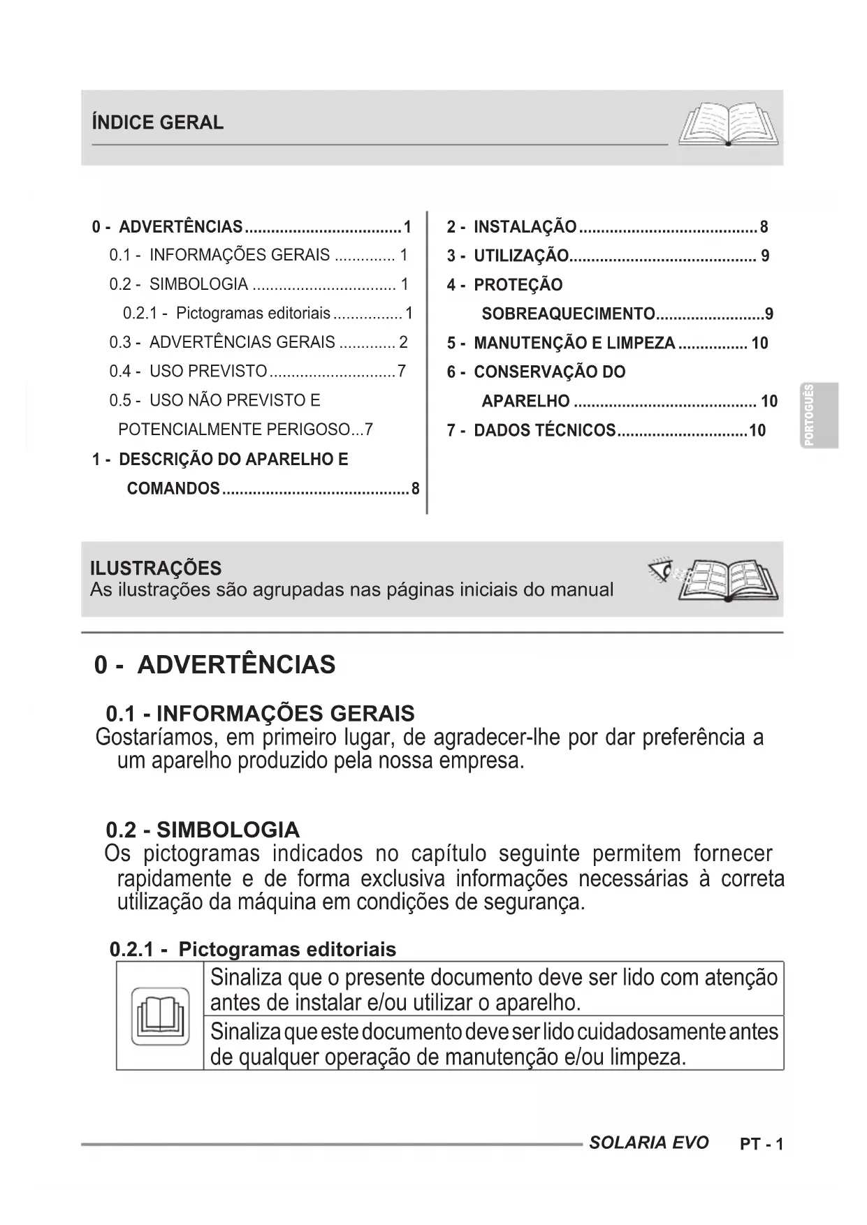 - Sinaliza que o presente documento deve ser lido com atenção antes de instalar e/ou utilizar o aparelho. Sinaliza que este documento deve ser lido cuidadosamente antes de qualquer operação de manutenção e/ou limpeza. ÍNDICE GERAL 0 - ADVERTÊNCIAS p. 10