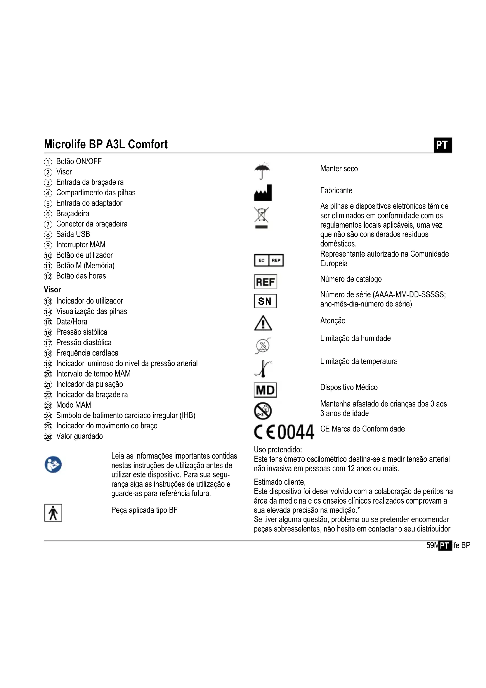 Visor Uso pretendido: Este tensiómetro oscilométrico destina-se a medir tensão arterial não invasiva em pessoas com 12 anos ou mais. Estimado cliente, Este dispositivo foi desenvolvido com a colaboração de peritos na área da medicina e os ensaios clínicos realizados comprovam a sua elevada precisão na medição.* Se tiver alguma questão, problema ou se pretender encomendar peças sobresselentes, não hesite em contactar o seu distribuidor Microlife BP A3L Comfort