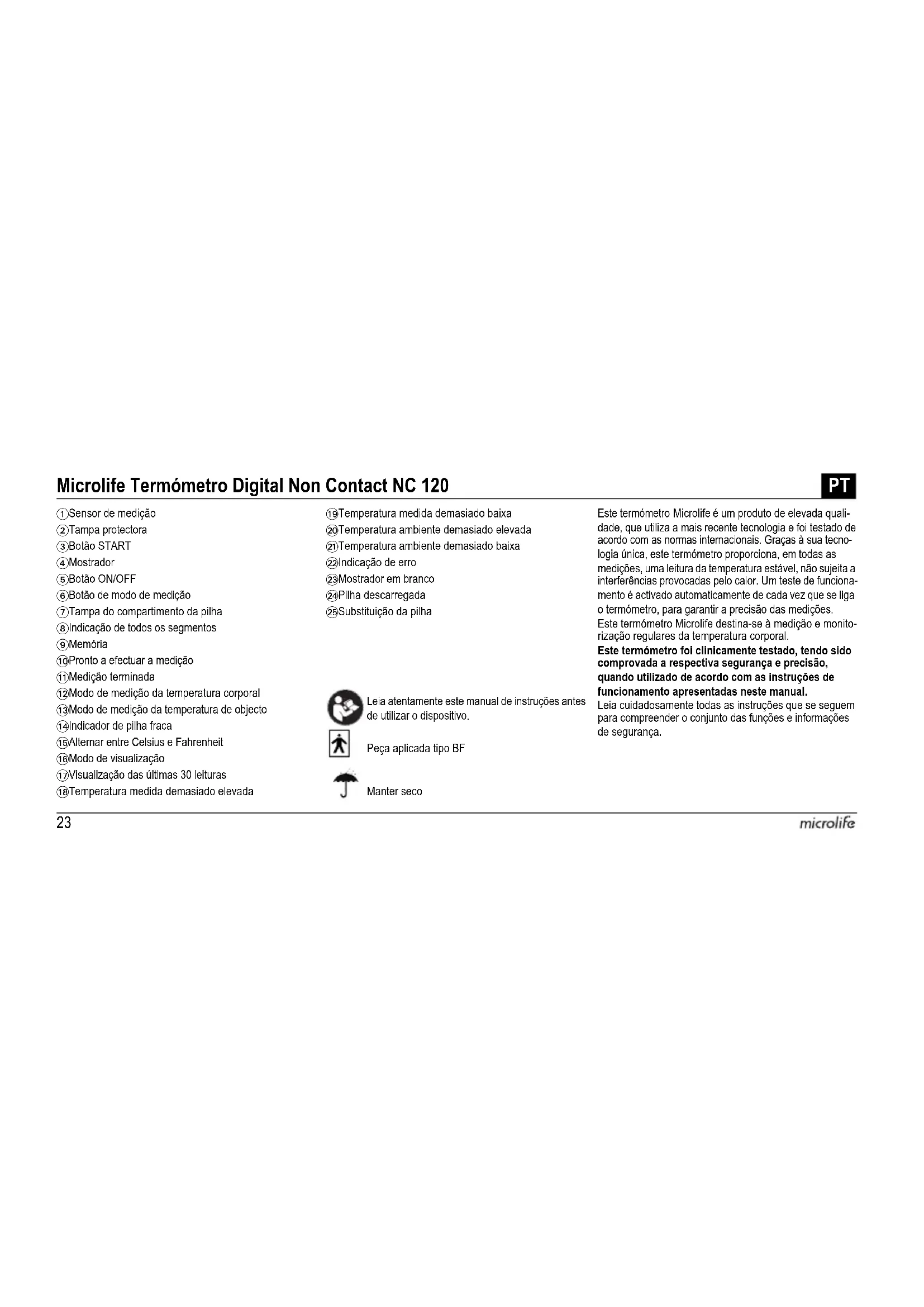g (sin batería) Clase IP: IP21 Referencia a los estándares: ASTM E1965; IEC 60601-1; IEC 60601-1-2 (EMC); IEC 60601-1-11 Vida útil espe- rada: 5 años o 12000 mediciones22NC 120 ES23 Leia atentamente este manual de instruções antes de utilizar o dispositivo. Peça aplicada tipo BF Este termómetro Microlife é um produto de elevada quali- dade, que utiliza a mais recente tecnologia e foi testado de acordo com as normas internacionais. Graças à sua tecno- logia única, este termómetro proporciona, em todas as medições, uma leitura da temperatura estável, não sujeita a interferências provocadas pelo calor. Um teste de funciona- mento é activado automaticamente de cada vez que se liga o termómetro, para garantir a precisão das medições. Este termómetro Microlife destina-se à medição e monito- rização regulares da temperatura corporal. Este termómetro foi clinicamente testado, tendo sido comprovada a respectiva segurança e precisão, quando utilizado de acordo com as instruções de funcionamento apresentadas neste manual. Leia cuidadosamente todas as instruções que se seguem para compreender o conjunto das funções e informações de segurança. Microlife Termómetro Digital Non Contact NC 120