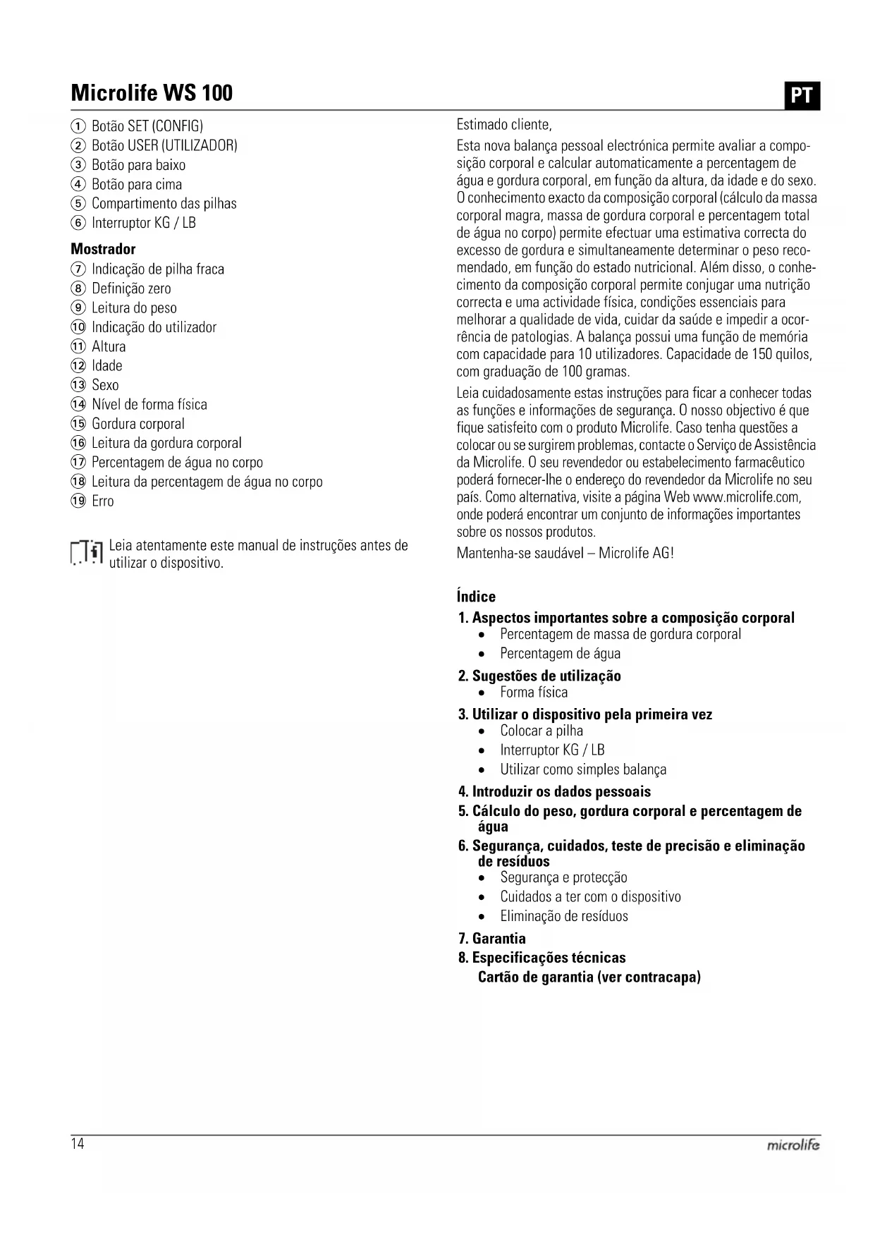 Precisión y repetibilidad con una tolerancia de: +/- 1 % + 0.1 kg / 0.2 lb / 1/4 st14 Mostrador Estimado cliente, Esta nova balança pessoal electrónica permite avaliar a compo- sição corporal e calcular automaticamente a percentagem de água e gordura corporal, em função da altura, da idade e do sexo. O conhecimento exacto da composição corporal (cálculo da massa corporal magra, massa de gordura corporal e percentagem total de água no corpo) permite efectuar uma estimativa correcta do excesso de gordura e simultaneamente determinar o peso reco- mendado, em função do estado nutricional. Além disso, o conhe- cimento da composição corporal permite conjugar uma nutrição correcta e uma actividade física, condições essenciais para melhorar a qualidade de vida, cuidar da saúde e impedir a ocor- rência de patologias. A balança possui uma função de memória com capacidade para 10 utilizadores. Capacidade de 150 quilos, com graduação de 100 gramas. Leia cuidadosamente estas instruções para ficar a conhecer todas as funções e informações de segurança. O nosso objectivo é que fique satisfeito com o produto Microlife. Caso tenha questões a colocar ou se surgirem problemas, contacte o Serviço de Assistência da Microlife. O seu revendedor ou estabelecimento farmacêutico poderá fornecer-lhe o endereço do revendedor da Microlife no seu país. Como alternativa, visite a página Web www.microlife.com, onde poderá encontrar um conjunto de informações importantes sobre os nossos produtos. Mantenha-se saudável – Microlife AG! Índice
