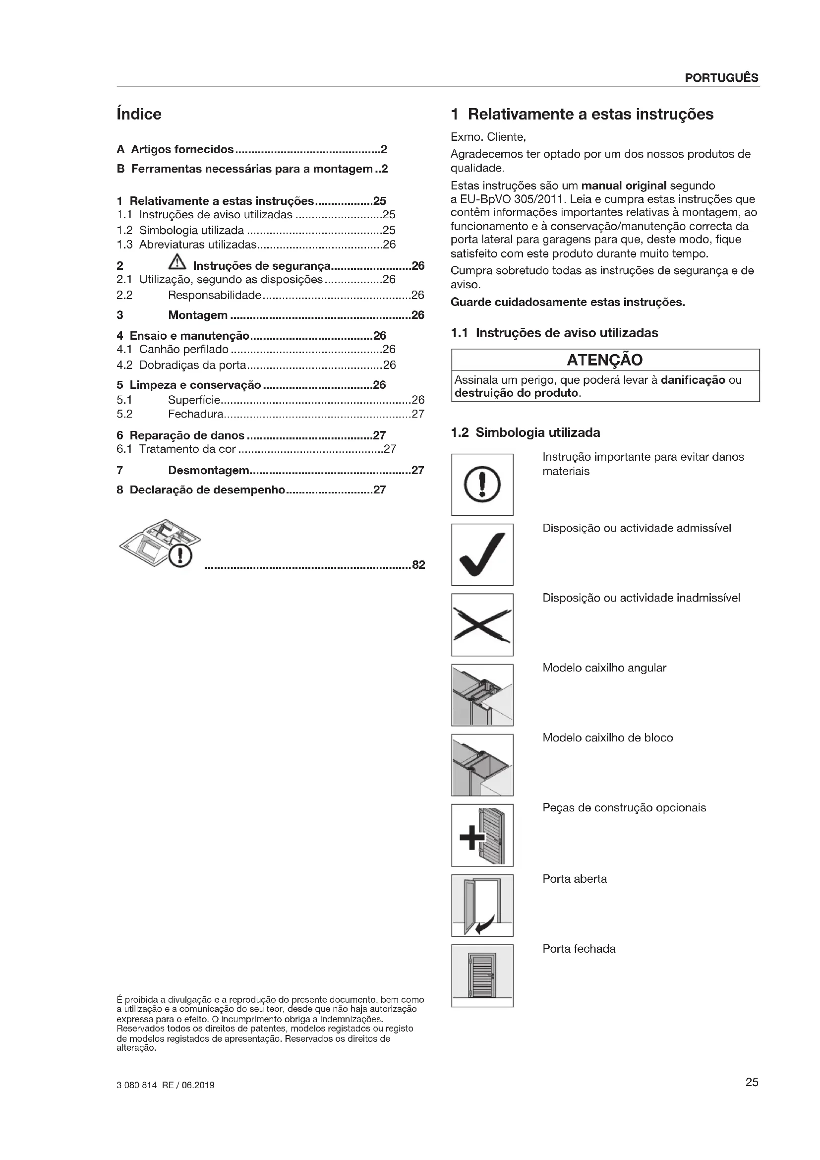3 080 814 RE / 06.2019 ITALIANO1 Relativamente a estas instruções Exmo. Cliente, Agradecemos ter optado por um dos nossos produtos de qualidade. Estas instruções são um manual original segundo aEU-BpVO 305/2011. Leia e cumpra estas instruções que contêm informações importantes relativas à montagem, ao funcionamento e à conservação/manutenção correcta da porta lateral para garagens para que, deste modo, fique satisfeito com este produto durante muito tempo. Cumpra sobretudo todas as instruções de segurança e de aviso. Guarde cuidadosamente estas instruções.