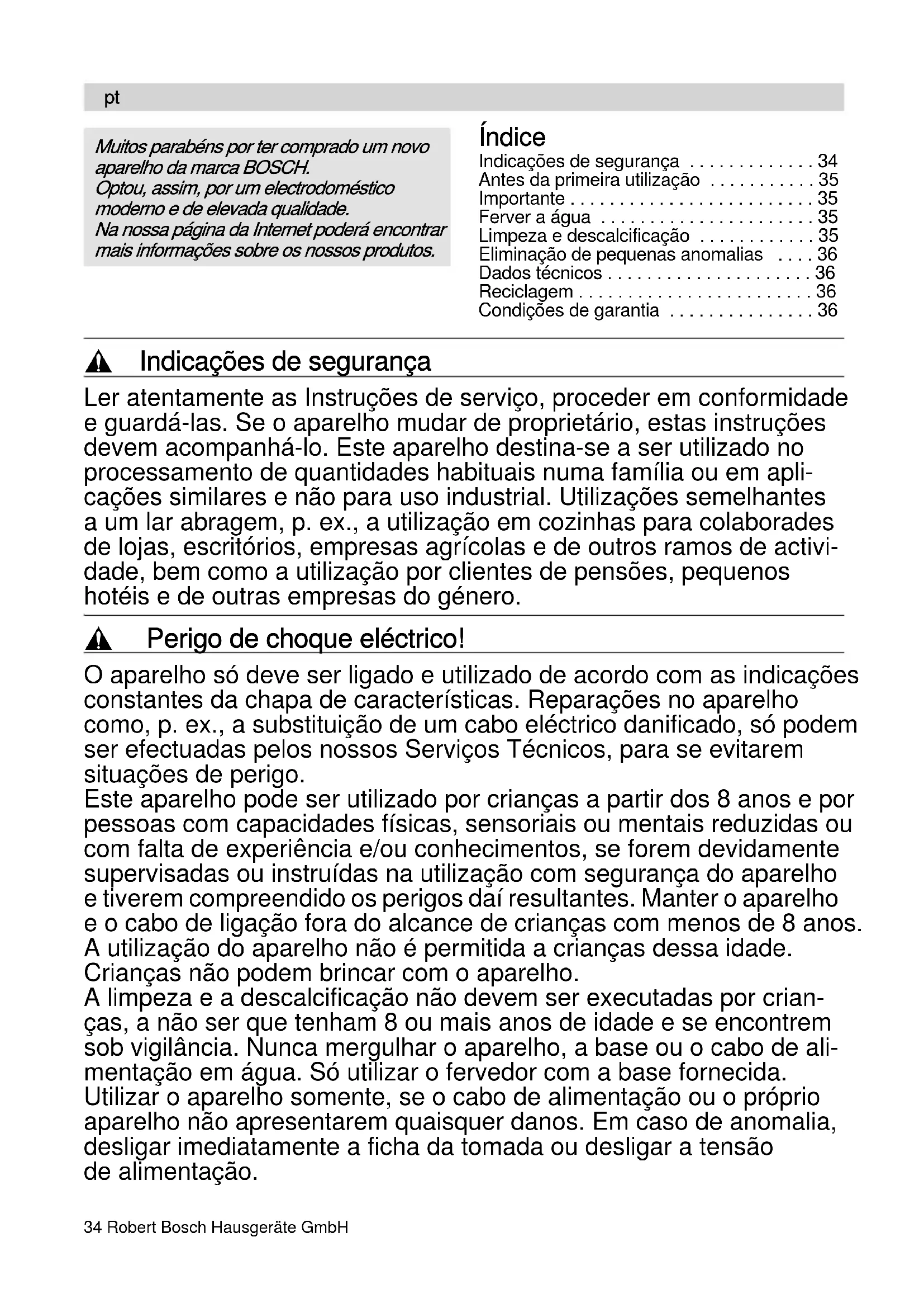 - Nos reservamos el derecho de introducir modificaciones.34 Robert Bosch Hausgeräte GmbH Índice Indicações de segurança p. 34