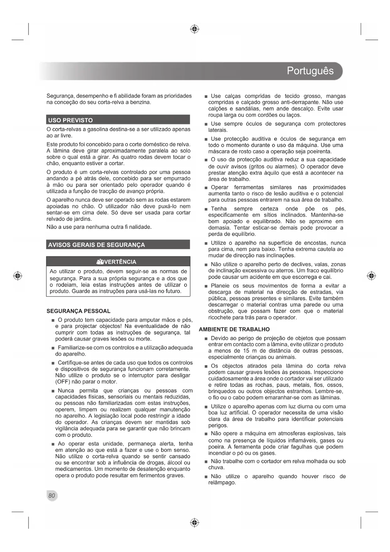 ■ O produto tem capacidade para amputar mãos e pés, e para projectar objectos! Na eventualidade de não cumprir com todas as instruções de segurança, tal poderá causar graves lesões ou morte. ■ Familiarize-se com os controlos e a utilização adequada do aparelho. ■ Certifique-se antes de cada uso que todos os controlos e dispositivos de segurança funcionam corretamente. Não utilize o produto se o interruptor para desligar (OFF) não parar o motor. ■ Nunca permita que crianças ou pessoas com capacidades físicas, sensoriais ou mentais reduzidas, ou pessoas não familiarizadas com estas instruções, operem, limpem ou realizem qualquer manutenção no aparelho. A legislação local pode restringir a idade do operador. As crianças devem ser mantidas sob vigilância adequada para se garantir que não brincam com o produto. ■ Ao operar esta unidade, permaneça alerta, tenha em atenção ao que está a fazer e use o bom senso. Não utilize o corta-relva quando se sentir cansado ou se encontrar sob a influência de drogas, álcool ou medicamentos. Um momento de desatenção enquanto opera o produto pode resultar em ferimentos graves. ■ Use calças compridas de tecido grosso, mangas compridas e calçado grosso anti-derrapante. Não use calções e sandálias, nem ande descalço. Evite usar roupa larga ou com cordões ou laços. ■ Use sempre óculos de segurança com protectores laterais. ■ Use protecção auditiva e óculos de segurança em todo o momento durante o uso da máquina. Use uma máscara de rosto caso a operação seja poeirenta. ■ O uso da protecção auditiva reduz a sua capacidade de ouvir avisos (gritos ou alarmes). O operador deve prestar atenção extra àquilo que está a acontecer na área de trabalho. ■ Operar ferramentas similares nas proximidades aumenta tanto o risco de lesão auditiva e o potencial para outras pessoas entrarem na sua área de trabalho. ■ Tenha sempre certeza onde põe os pés, especificamente em sítios inclinados. Mantenha-se bem apoiado e equilibrado. Não se aproxime em demasia. Tentar esticar-se demais pode provocar a perda de equilíbrio. ■ Utilize o aparelho na superfície de encostas, nunca para cima, nem para baixo. Tenha extrema cautela ao mudar de direcção nas inclinações. ■ Não utilize o aparelho perto de declives, valas, zonas de inclinação excessiva ou aterros. Um fraco equilíbrio pode causar um acidente em que escorrega e cai. ■ Planeie os seus movimentos de forma a evitar a descarga de material na direcção de estradas, via pública, pessoas presentes e similares. Evite também descarregar o material contras uma parede ou uma obstrução, que possam fazer com que o material ricochete para trás para o operador.