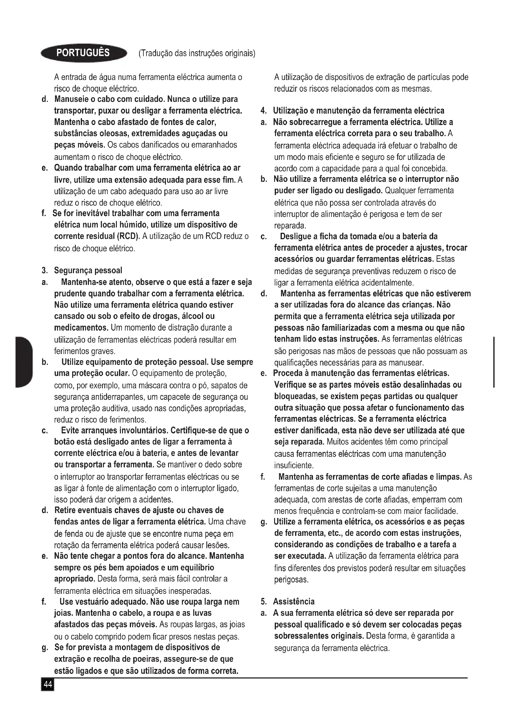 e. Proceda à manutenção das ferramentas elétricas. Verifique se as partes moveris está desalinhadas ou bloqueadas, se existem peças partidas ou qualquer窗外 situação que possa afetar o Functionamento das ferramentas elétricas. Se a ferramenta elétrica estiver danificada, esta não deve ser realizada até que sera reparada. Muito acidentes tem como principal causa ferramentas elétricas com uma manutenção insufficiente.