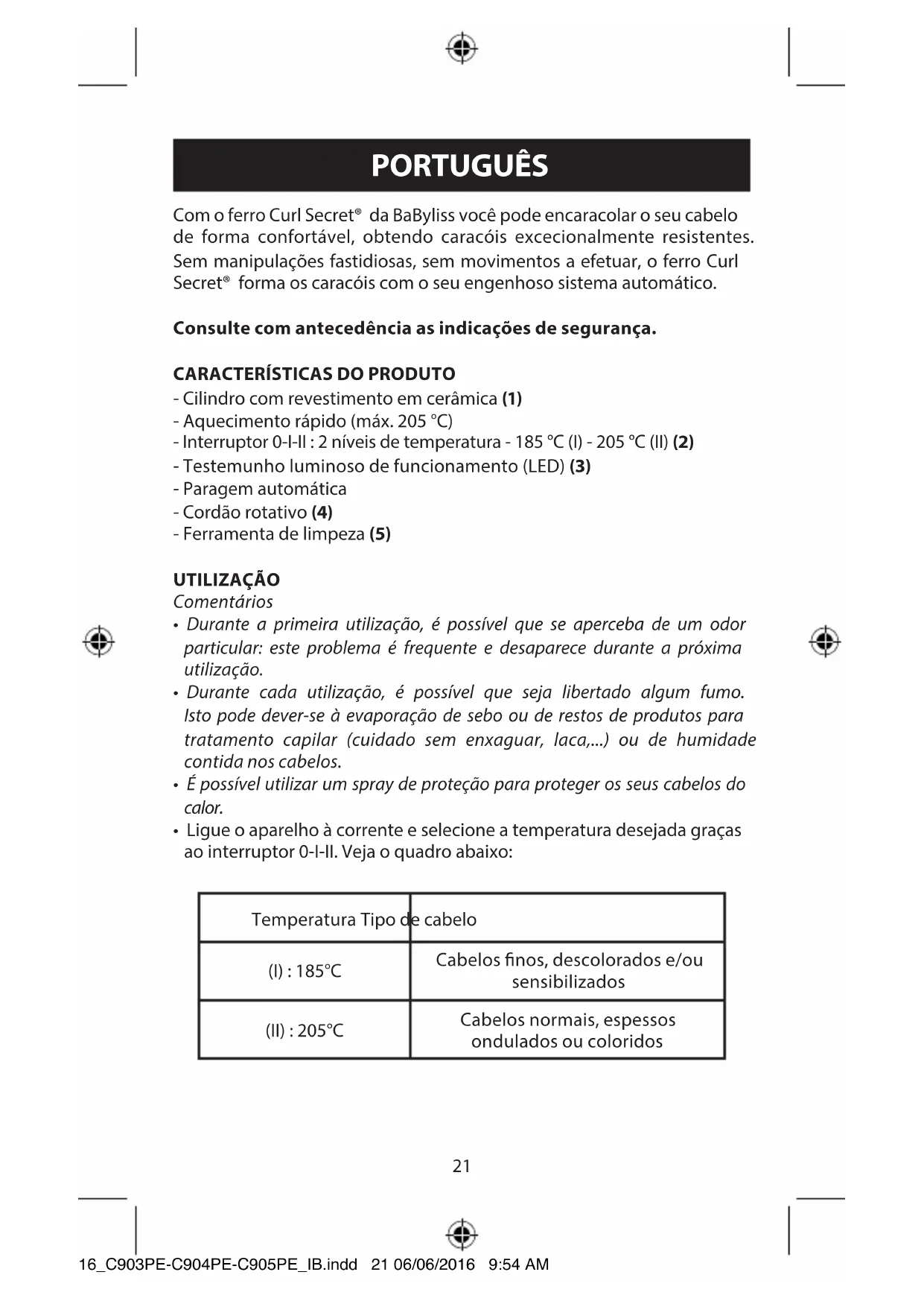 - Ligue o aparelho à corrente e selecione a temperatura desejada graças ao interruptor 0-I-II. Veja o quadro abaixo: Temperatura Tipo de cabelo (I) : 185°C Cabelos nos, descolorados e/ou sensibilizados (II) : 205°C Cabelos normais, espessos ondulados ou coloridos 16_C903PE-C904PE-C905PE_IB.indd 21 06/06/2016 9:54 AM22