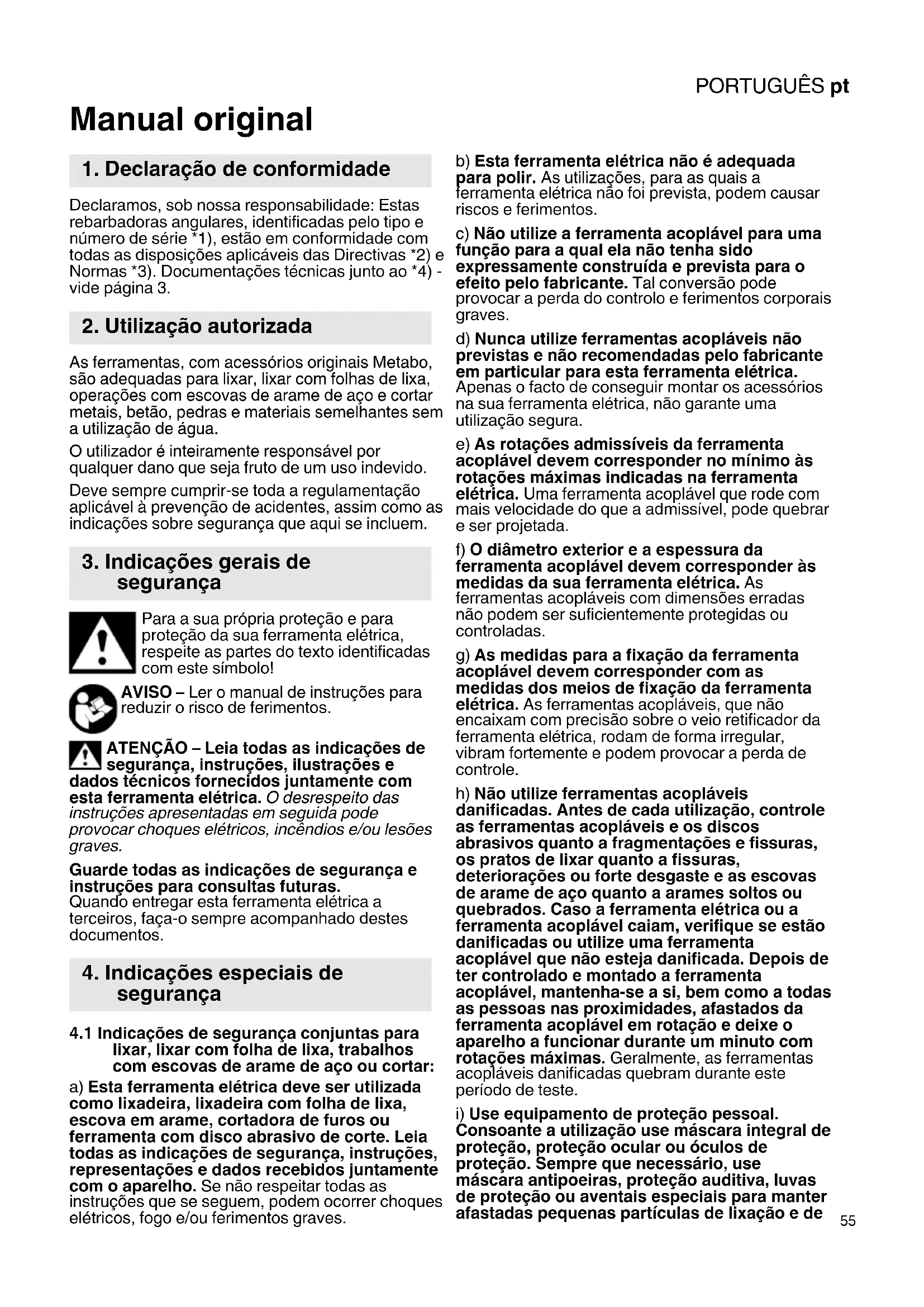 Manual original Declaramos, sob nossa responsabilidade: Estas rebarbadoras angulares, identificadas pelo tipo e número de série *1), estão em conformidade com todas as disposições aplicáveis das Directivas *2) e Normas *3). Documentações técnicas junto ao *4) - vide página 3. As ferramentas, com acessórios originais Metabo, são adequadas para lixar, lixar com folhas de lixa, operações com escovas de arame de aço e cortar metais, betão, pedras e materiais semelhantes sem a utilização de água. O utilizador é inteiramente responsável por qualquer dano que seja fruto de um uso indevido. Deve sempre cumprir-se toda a regulamentação aplicável à prevenção de acidentes, assim como as indicações sobre segurança que aqui se incluem. Para a sua própria proteção e para proteção da sua ferramenta elétrica, respeite as partes do texto identificadas com este símbolo! AVISO – Ler o manual de instruções para reduzir o risco de ferimentos. ATENÇÃO – Leia todas as indicações de segurança, instruções, ilustrações e dados técnicos fornecidos juntamente com esta ferramenta elétrica. O desrespeito das instruções apresentadas em seguida pode provocar choques elétricos, incêndios e/ou lesões graves. Guarde todas as indicações de segurança e instruções para consultas futuras. Quando entregar esta ferramenta elétrica a terceiros, faça-o sempre acompanhado destes documentos.