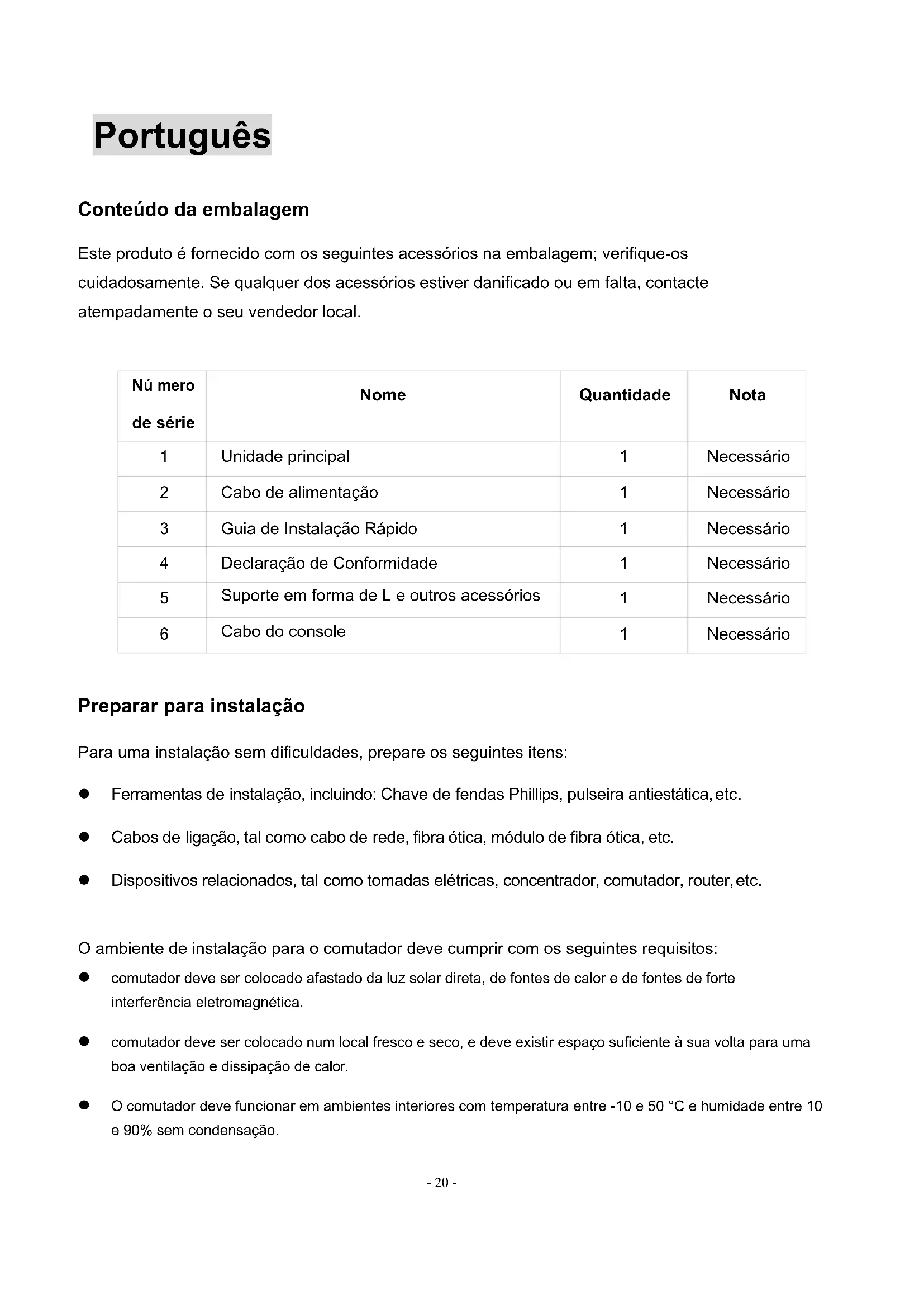 Preparar para instalação Para uma instalação sem dificuldades, prepare os seguintes itens: l Ferramentas de instalação, incluindo: Chave de fendas Phillips, pulseira antiestática, etc. l Cabos de ligação, tal como cabo de rede, fibra ótica, módulo de fibra ótica, etc. l Dispositivos relacionados, tal como tomadas elétricas, concentrador, comutador, router, etc. O ambiente de instalação para o comutador deve cumprir com os seguintes requisitos: l comutador deve ser colocado afastado da luz solar direta, de fontes de calor e de fontes de forte interferência eletromagnética. l comutador deve ser colocado num local fresco e seco, e deve existir espaço suficiente à sua volta para uma boa ventilação e dissipação de calor. l O comutador deve funcionar em ambientes interiores com temperatura entre -10 e 50 °C e humidade entre 10 e 90% sem condensação.- 21 -