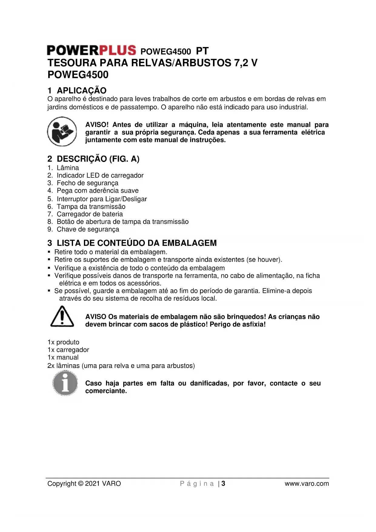 VARO – Vic. Van Rompuy N.V. – Joseph Van Instraat 9 – BE2500 Lier – Bélgica, declara que, Designação do aparelho: TESOURA PARA RELVAS/ARBUSTOS 7,2 V Marca: PowerPlus Modelo nº.: POWEG4500 se encontra em conformidade com os requisitos essenciais e outras provisões relevantes das Diretivas Comunitárias aplicáveis, com base na aplicação das normas Europeias harmonizadas. Qualquer alteração não autorizada do equipamento anula esta declaração. Diretivas Europeias (incluindo, se aplicável, as respetivas emendas até à data de assinatura): 2011/65/EU 2006/42/EC 2014/30/EU 2000/14/EC Annex V LwA Measured 77dB(A) Guaranteed 90dB(A) Normas Europeias harmonizadas (incluindo, se aplicável, as respetivas emendas até à data de assinatura): EN60745-1 : 2009 EN60745-2-15 : 2009 EN60335-1 : 2012 EN50636-2-94 : 2014 EN55014-1 : 2017 EN55014-2 : 2015 Detentor da Documentação Técnica: Philippe Vankerkhove, VARO – Vic. Van Rompuy N.V. O signatário atua em nome da administração da empresa, Philippe Vankerkhove Assuntos Regulamentares – Gestor de Conformidade 28/05/2021, Lier - BelgiumPOWEG4500 NO Copyright © 2021 VARO S i d e | 1 www.varo.com 1 BRUKSOMRÅDE ............................................................................. 3
