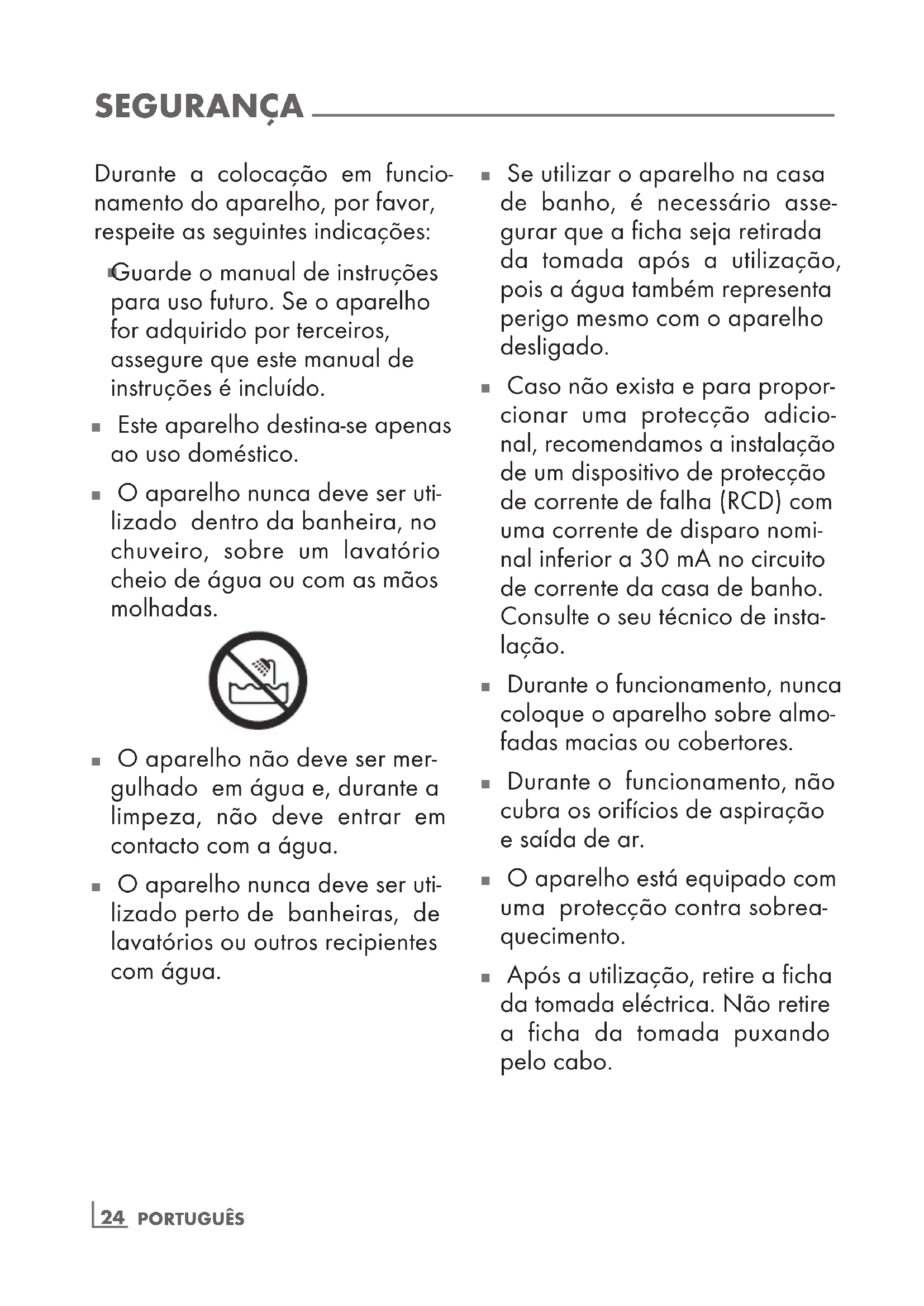 Se utilizar o aparelho na casa de banho, é necessário asse- gurar que a ficha seja retirada da tomada após a utilização, pois a água também representa perigo mesmo com o aparelho desligado.