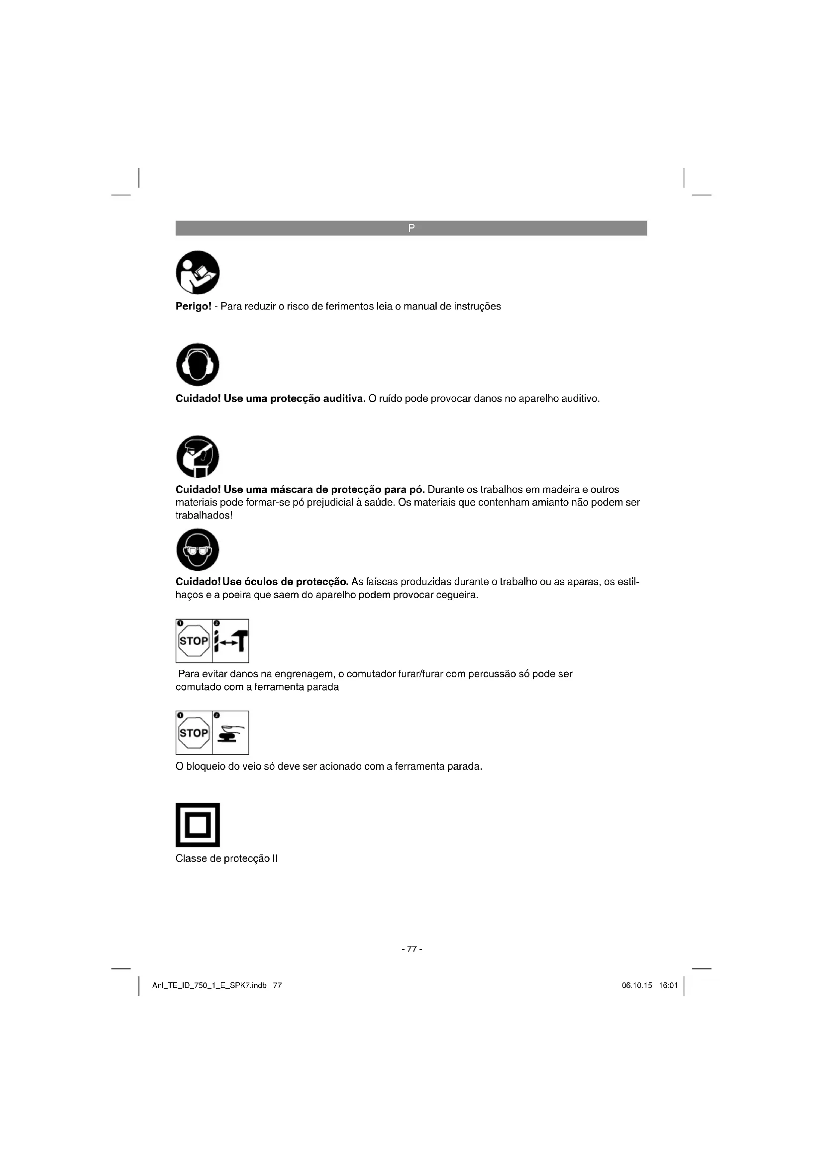 Perigo! - Para reduzir o risco de ferimentos leia o manual de instruções Cuidado! Use uma protecção auditiva. O ruído pode provocar danos no aparelho auditivo. Cuidado! Use óculos de protecção. As faíscas produzidas durante o trabalho ou as aparas, os estil- haços e a poeira que saem do aparelho podem provocar cegueira. Cuidado! Use uma máscara de protecção para pó. Durante os trabalhos em madeira e outros materiais pode formar-se pó prejudicial à saúde. Os materiais que contenham amianto não podem ser trabalhados! Para evitar danos na engrenagem, o comutador furar/furar com percussão só pode ser comutado com a ferramenta parada Classe de protecção II O bloqueio do veio só deve ser acionado com a ferramenta parada. Anl_TE_ID_750_1_E_SPK7.indb 77Anl_TE_ID_750_1_E_SPK7.indb 77 06.10.15 16:0106.10.15 16:01P