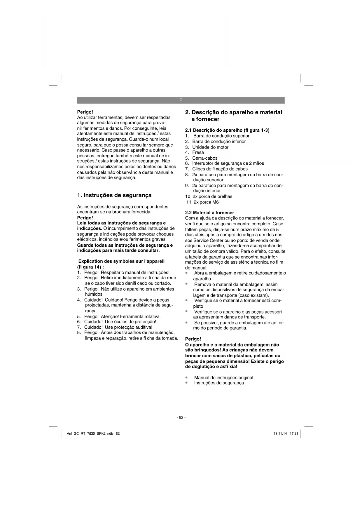 Perigo! Ao utilizar ferramentas, devem ser respeitadas algumas medidas de segurança para preve- nir ferimentos e danos. Por conseguinte, leia atentamente este manual de instruções / estas instruções de segurança. Guarde-o num local seguro, para que o possa consultar sempre que necessário. Caso passe o aparelho a outras pessoas, entregue também este manual de in- struções / estas instruções de segurança. Não nos responsabilizamos pelos acidentes ou danos causados pela não observância deste manual e das instruções de segurança.