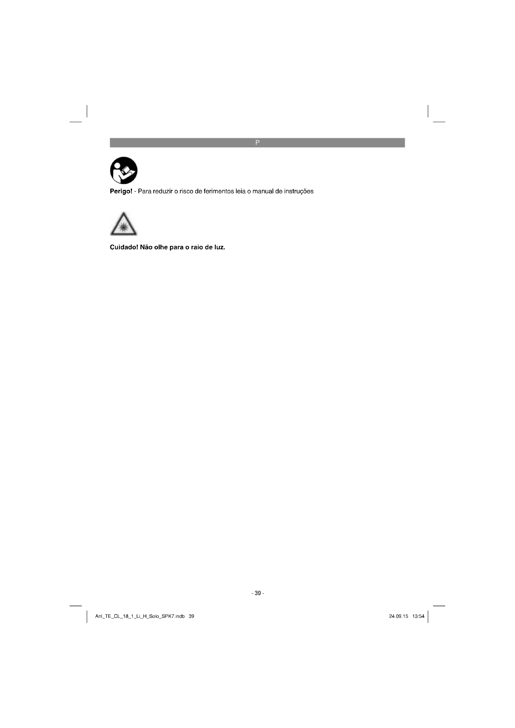 Perigo! - Para reduzir o risco de ferimentos leia o manual de instruções Cuidado! Não olhe para o raio de luz. Anl_TE_CL_18_1_Li_H_Solo_SPK7.indb 39Anl_TE_CL_18_1_Li_H_Solo_SPK7.indb 39 24.09.15 13:5424.09.15 13:54P