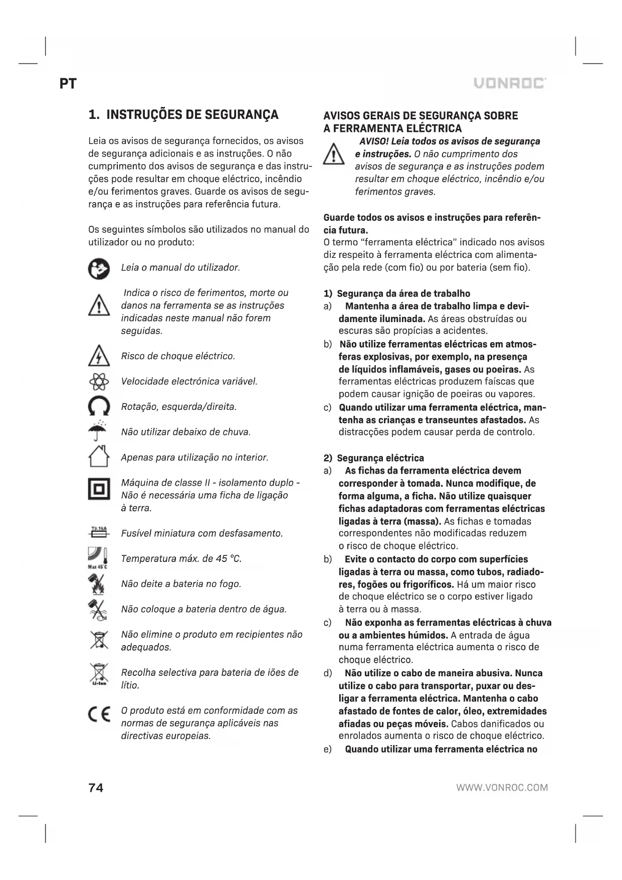 a) Não abra abateria. Perigo de curto-circuito. b) Proteja abateria do calor, por exemplo, contra exposição contínua aluz solar, fogo, água ehu- midade. Perigo de explosão. c) Em caso de danos euso inadequado da bateria, podem ser emitidos vapores. Ventile aárea econtacte um médico se houver queixas. Os vapores podem irritar osistema respiratório. d) Utilize abateria em conjunto com oseu produto industrial da Vonroc. Esta é aúnica protecção contra sobrecarga perigosa. e) Abateria pode ser perfurada por objectos da- nificados como pregos ou chaves de parafusos ou se for aplicada força externa. Pode ocorrer um curto-circuito interno eabateria pode quei- mar, causar fumo, explodir ou sobreaquecer.