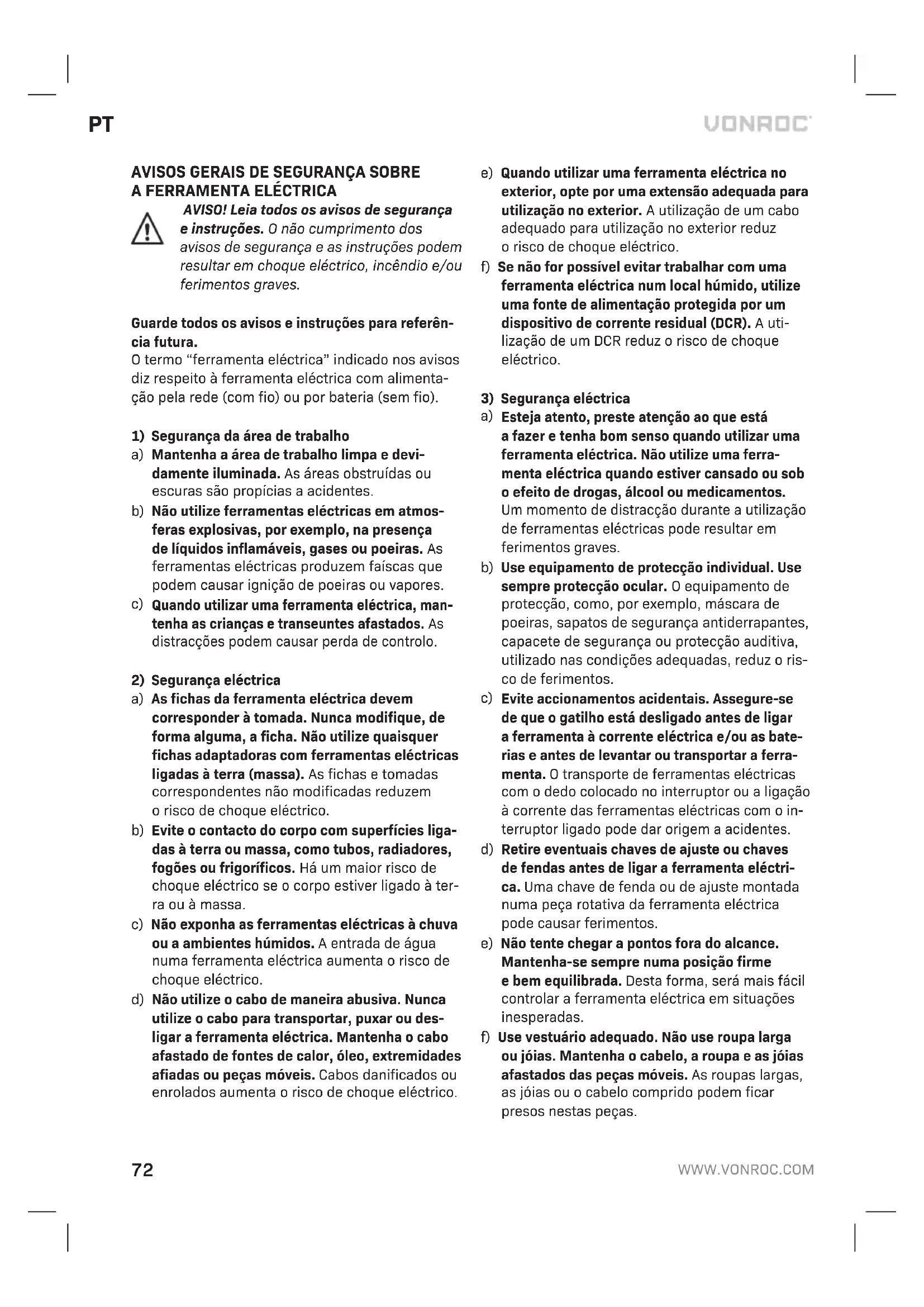 AVISO! Leia todos os avisos de segurança einstruções. Onão cumprimento dos avisos de segurança eas instruções podem resultar em choque eléctrico, incêndio e/ou ferimentos graves. Guarde todos os avisos einstruções para referên- cia futura. Otermo “ferramenta eléctrica” indicado nos avisos diz respeito àferramenta eléctrica com alimenta- ção pela rede (com fio) ou por bateria (sem fio).