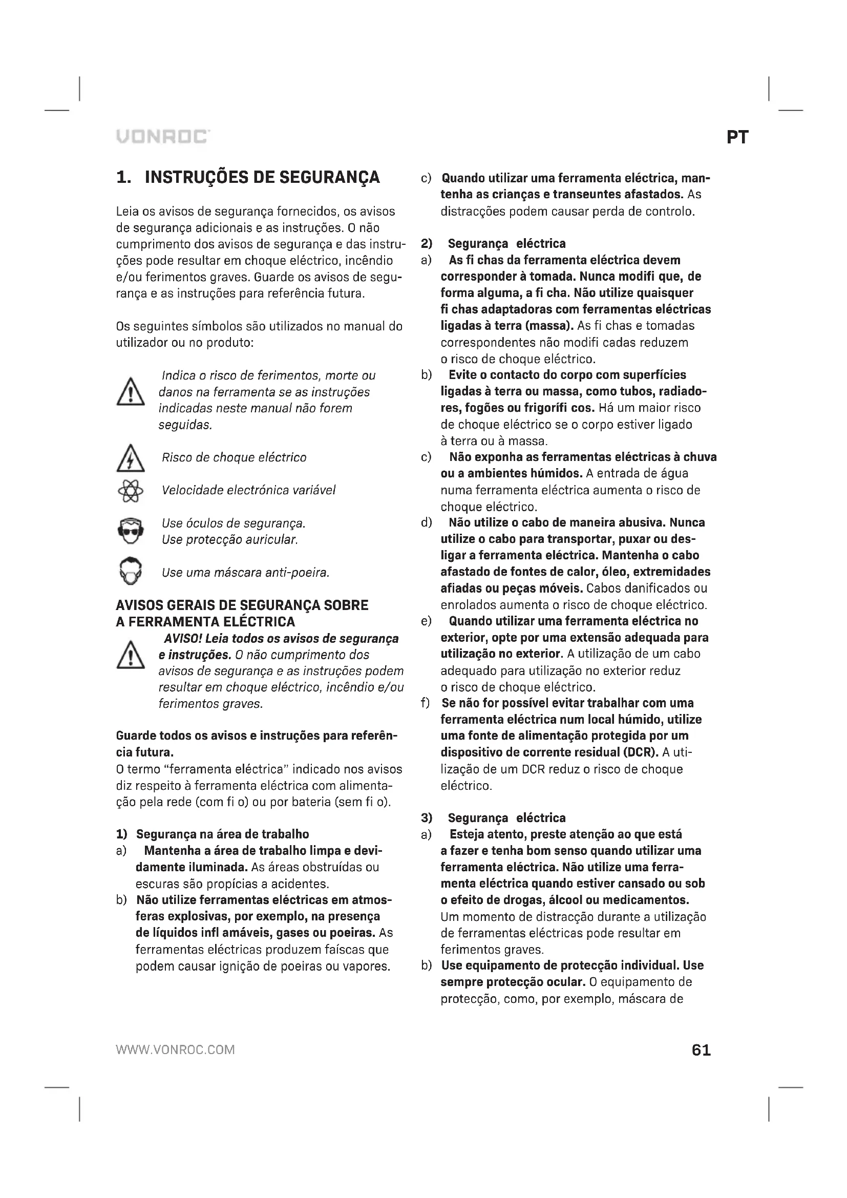 Quando efectuar otrabalho de manutenção no motor, oequipamento não deve estar sob tensão. Limpe acarcaça da máquina com regularidade com um pano macio, de preferência após cada uti- lização. Certifi que-se de que as aberturas de ven- tilação não têm pó ou sujidade. Retire asujidade muito persistente com um pano macio humedecido com água de sabão. Não utilize solventes, como gasolina, álcool, amoníaco, etc. Este tipo de produ- tos químicos danifi cam os componentes sintéticos. AMBIENTE Os equipamentos eléctricos ou electrónicos defeituosos e/ou eliminados devem ser recolhidos em locais de reciclagem adequa- dos. Apenas para os países da CE Não elimine as ferramentas eléctricas em conjun- to com os resíduos domésticos. De acordo com adirectiva europeia 2012/19/CE sobre resíduos de equipamentos eléctricos eelectrónicos eares- pectiva implementação na legislação nacional, as ferramentas eléctricas que já não sejam utilizadas devem ser recolhidas em separado eeliminadas de maneira ecológica. GARANTIA Os produtos da VONROC são desenvolvidos de acordo com os padrões de qualidade mais ele- vados enão apresentam quaisquer defeitos em termos de materiais emão-de-obra em relação ao período estipulado por lei, cujo início é apartir da data de compra original. Se oproduto apresentar qualquer falha durante este período devido aqual- quer defeito no material e/ou de mão-de-obra, contacte aVONROC directamente. As seguintes circunstâncias estão excluídas desta garantia: