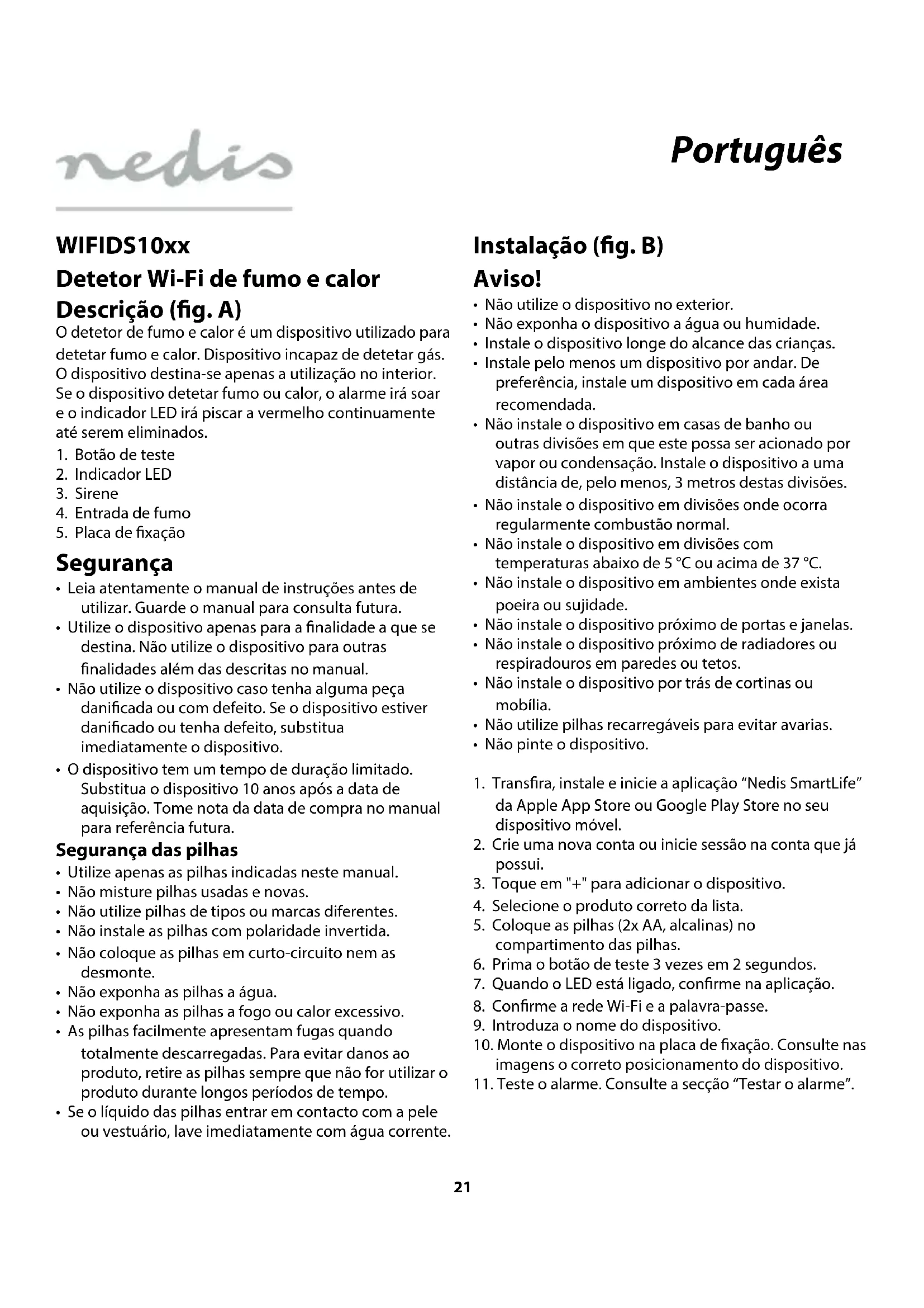 WIFIDS10xx Detetor Wi-Fi de fumo e calor Descrição (g. A) O detetor de fumo e calor é um dispositivo utilizado para detetar fumo e calor. Dispositivo incapaz de detetar gás. O dispositivo destina-se apenas a utilização no interior. Se o dispositivo detetar fumo ou calor, o alarme irá soar e o indicador LED irá piscar a vermelho continuamente até serem eliminados.