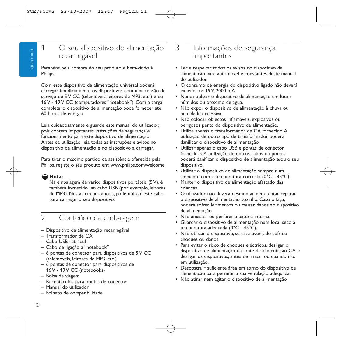 Baixe as instruções para o seu em formato PDF gratuitamente! Encontre o seu manual SCE7640 - PHILIPS e retome o controlo do seu dispositivo eletrónico. Nesta página estão publicados todos os documentos necessários para a utilização do seu dispositivo. SCE7640 da marca PHILIPS.