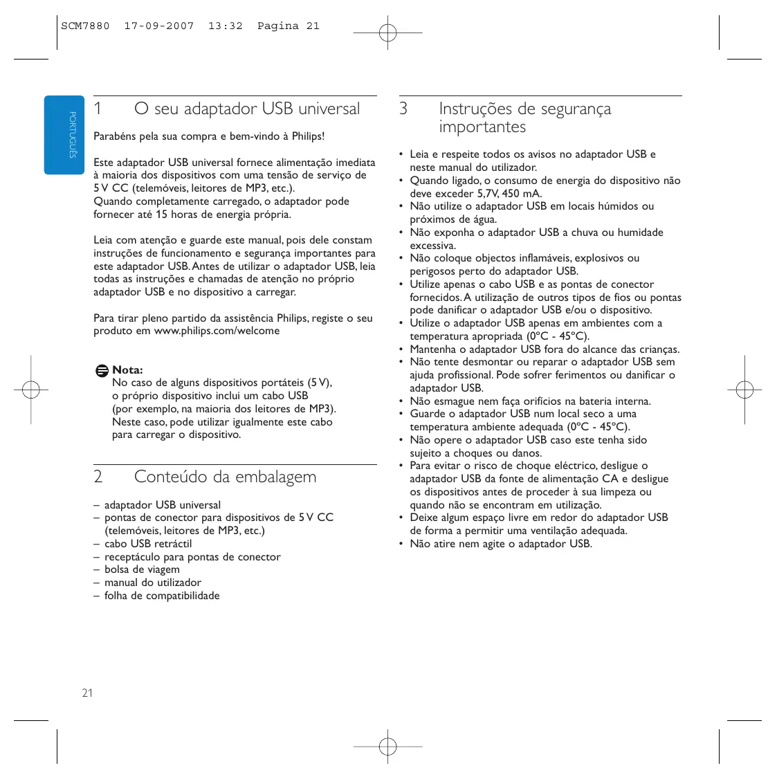 Leia com atenção e guarde este manual,.POis dele constam instruções de functimento e segurarça importantes para este adaptorador USB.Antes de utilizes o adaptorador USB,leia todas as instruções e chamadas de atenção noproprio adaptorador USB e no dispositivo a carregar.
