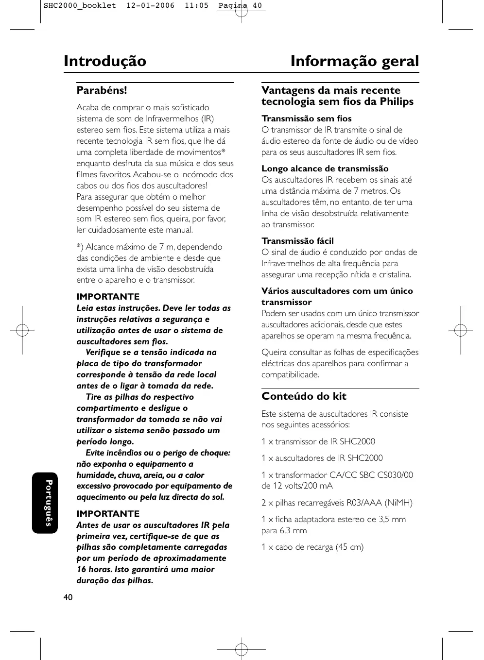 Italiano Sicurezza d'ascolto! Un uso continuo ad alto volume può provocare danni permanenti all'udito. SHC2000_booklet 12-01-2006 11:05 Pagina 40 Introdução Parabéns! Acaba de comprar o mais sofisticado sistema de som de Infravermelhos (IR) estereo sem fios. Este sistema utiliza a mais recente tecnologia IR sem fios, que lhe dá uma completa liberdade de movimentos* enquanto desfruta da sua música e dos seus filmes favoritos. Acabou-se o incómodo dos cabos ou dos fios dos auscultadores! Para assegurar que obtém o melhor desempenho possível do seu sistema de som IR estereo sem fios, queira, por favor, ler cuidadosamente este manual. *) Alcance máximo de 7 m, dependendo das condições de ambiente e desde que exista uma linha de visão desobstruída entre o aparelho e o transmissor. Português IMPORTANTE Leia estas instruções. Deve ler todas as instruções relativas a segurança e utilização antes de usar o sistema de auscultadores sem fios. Verifique se a tensão indicada na placa de tipo do transformador corresponde à tensão da rede local antes de o ligar à tomada da rede. Tire as pilhas do respectivo compartimento e desligue o transformador da tomada se não vai utilizar o sistema senão passado um período longo. Evite incêndios ou o perigo de choque: não exponha o equipamento a humidade, chuva, areia, ou a calor excessivo provocado por equipamento de aquecimento ou pela luz directa do sol. IMPORTANTE Antes de usar os auscultadores IR pela primeira vez, certifique-se de que as pilhas são completamente carregadas por um período de aproximadamente 16 horas. Isto garantirá uma maior duração das pilhas.