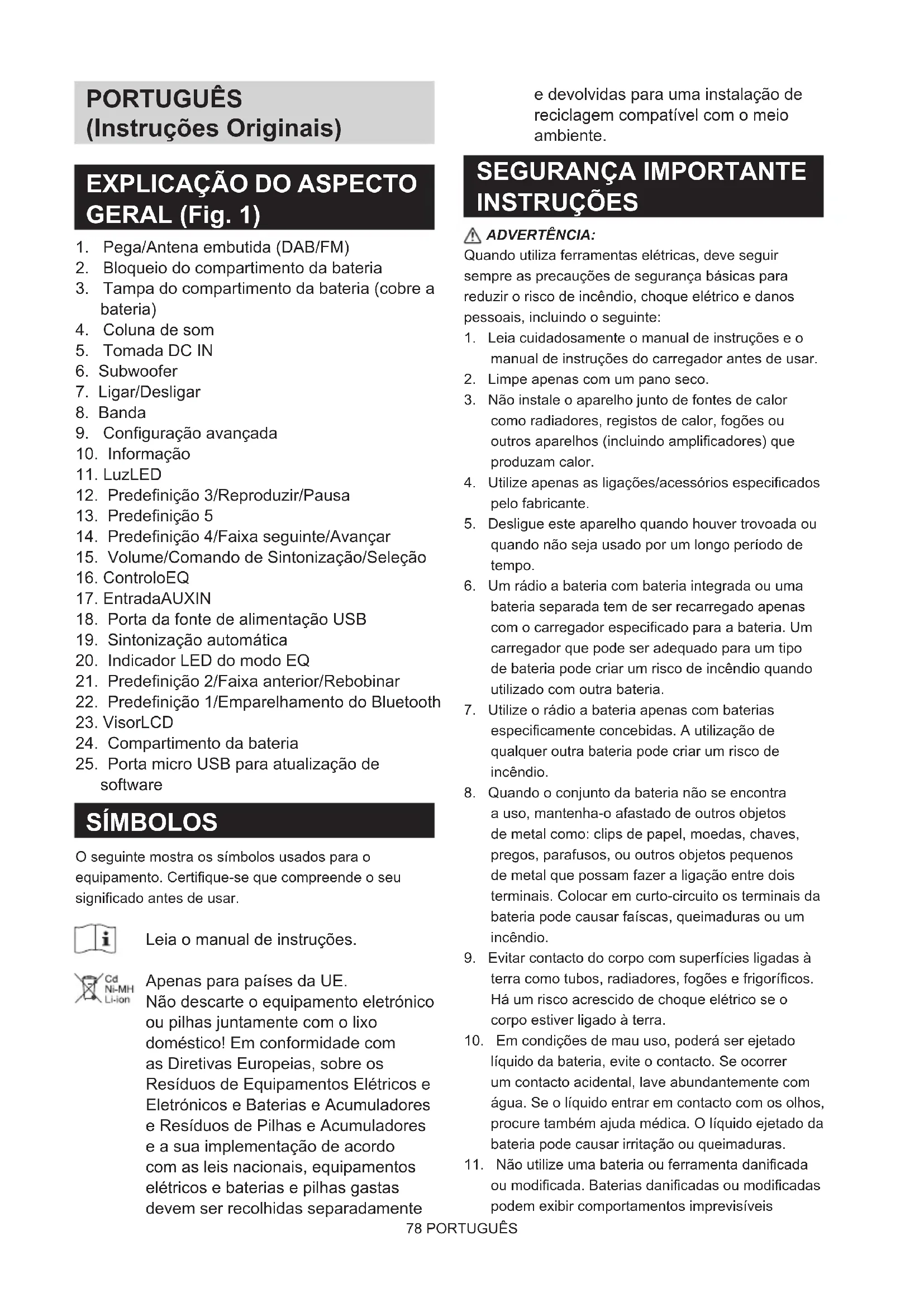 INSTRUÇÕES ADVERTÊNCIA: Quando utiliza ferramentas elétricas, deve seguir sempre as precauções de segurança básicas para reduzir o risco de incêndio, choque elétrico e danos pessoais, incluindo o seguinte: