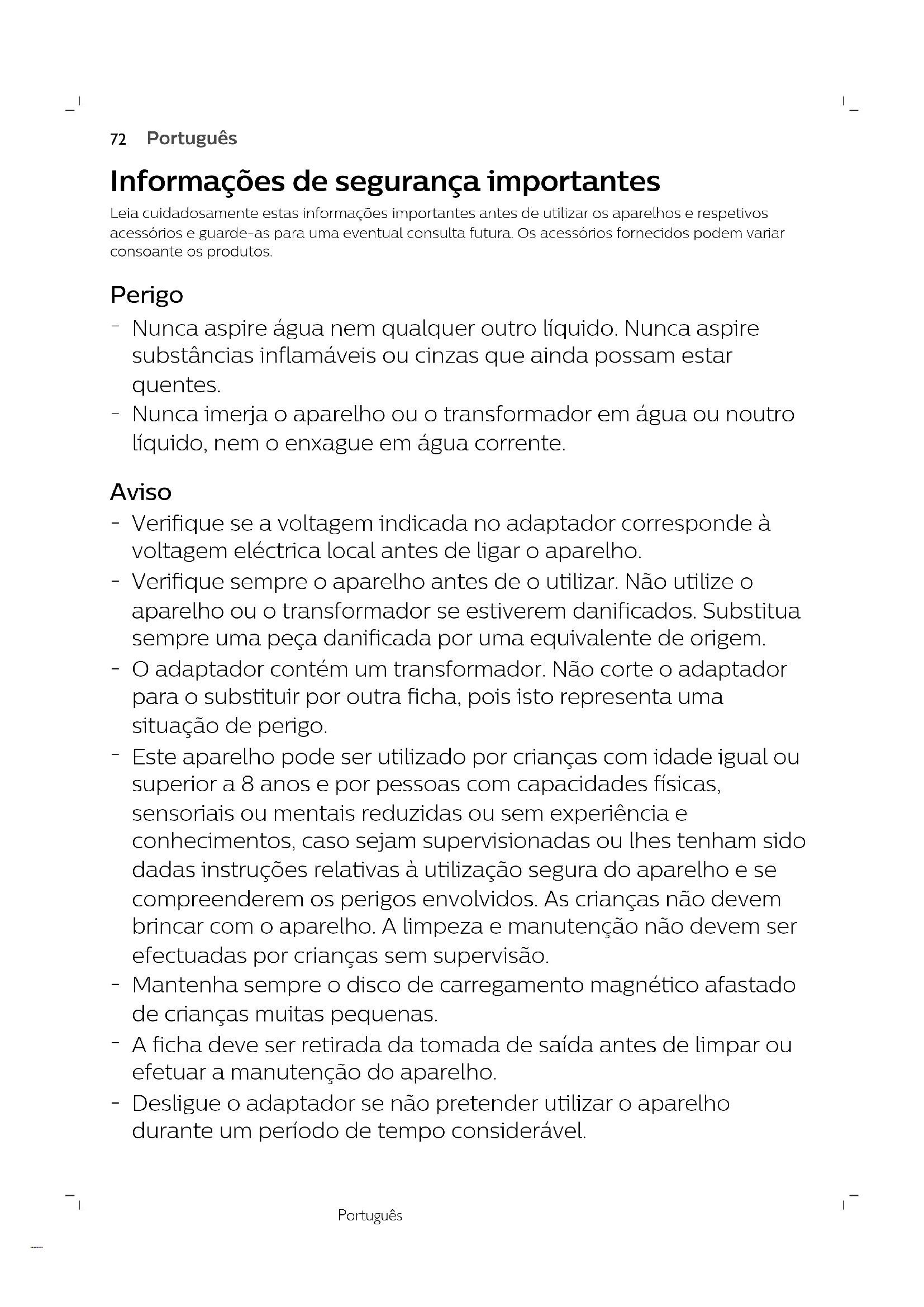 Este aspirador foi concebido apenas para utilização doméstica. Não o utilize para aspirar resíduos de obras, pó de cimento, cinzas, areia fina, cal e substâncias semelhantes. Nunca utilize o aspirador sem um ou mais dos filtros. Isto pode danificar o motor e reduzir a vida útil do aspirador. Limpe sempre todas as peças do aspirador conforme indicado no manual do utilizador. Não limpe nenhuma peça com água e/ou agentes de limpeza se isto não for indicado especificamente no manual do utilizador. Cuidado