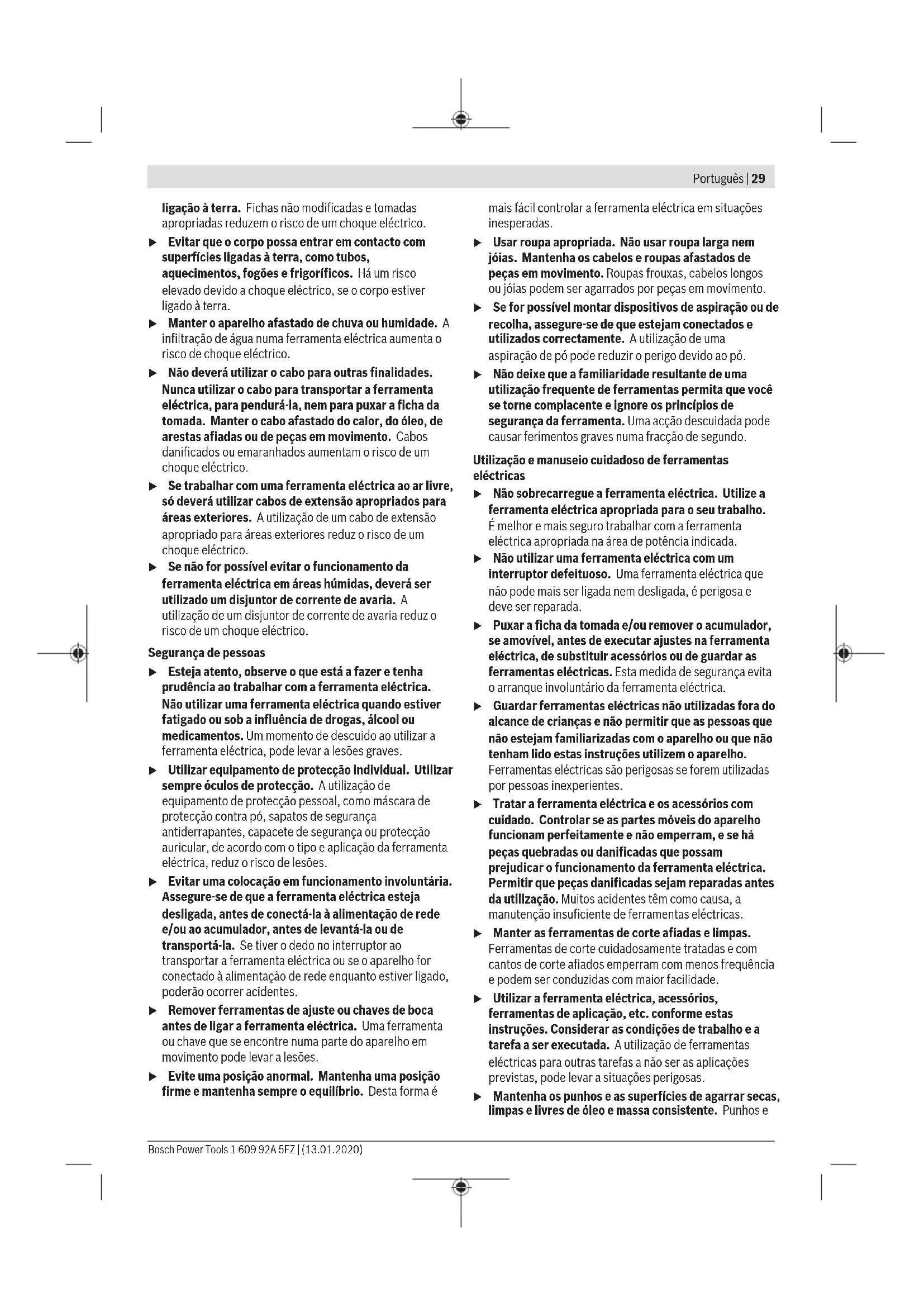 Santiago de Chile Tel.: (56) 02 782 0200 www.bosch.cl Ecuador Robert Bosch Sociedad Anónima Av. Rodrigo Chávez Gonzalez, Parque Empresarial Colón, Edif. Coloncorp Piso 1 Local 101-102 Guayaquil Tel.: (593) 3719100ext.214-215 E-mail: herramientas.bosch4@ec.bosch.com www.boschherramientas.com.ec México Robert Bosch S. de R.L. de C.V. Calle Robert Bosch No. 405 C.P. 50071 Zona Industrial, Toluca - Estado de México Tel.: (52) 55 528430-62 Tel.: 800 6271286 www.bosch-herramientas.com.mx Perú Robert Bosch S.A.C. Av. Primavera 781 Piso 2, Urb. Chacarilla San Borja Lima Tel.: (51) 1 706 1100 www.bosch.com.pe Venezuela Robert Bosch S.A. Calle Vargas con Buen Pastor, Edif. Alba, P-1, Boleita Norte, Caracas 1071 Tel.: (58) 212 207-4511 www.boschherramientas.com.ve Eliminación Recomendamos que las herramientas eléctricas, accesorios y embalajes sean sometidos a un proceso de recuperación que respete el medio ambiente. ¡No arroje las herramientas eléctricas a la basu- ra! Sólo para los países de laUE: Conforme a la Directiva Europea 2012/19/UE sobre apara- tos eléctricos y electrónicos inservibles, tras su transposi- ción en ley nacional, deberán acumularse por separado las herramientas eléctricas para ser sometidas a un reciclaje ecológico. El símbolo es solamente válido, si también se encuentra sobre la placa de características del producto/fabricado. Português Instruções de segurança Instruções gerais de segurança para ferramentas eléctricas AVISO Devem ser lidas todas as indicações de segurança, instruções, ilustrações e especificações desta ferramenta eléctrica. O desrespeito das instruções apresentadas abaixo poderá resultar em choque eléctrico, incêndio e/ou ferimentos graves. Guarde bem todas as advertências e instruções para futura referência. O termo "ferramenta eléctrica" utilizado a seguir nas indicações de advertência, refere‑se a ferramentas eléctricas operadas com corrente de rede (com cabo de rede) e a ferramentas eléctricas operadas com acumulador (sem cabo de rede). Segurança da área de trabalho u Mantenha a sua área de trabalho sempre limpa e bem iluminada. Desordem ou áreas de trabalho insuficientemente iluminadas podem levar a acidentes. u Não trabalhar com a ferramenta eléctrica em áreas com risco de explosão, nas quais se encontrem líquidos, gases ou pós inflamáveis. Ferramentas eléctricas produzem faíscas, que podem inflamar pós ou vapores. u Manter crianças e outras pessoas afastadas da ferramenta eléctrica durante a utilização. No caso de distracção é possível que perca o controlo sobre o aparelho. Segurança eléctrica u A ficha de conexão da ferramenta eléctrica deve caber na tomada. A ficha não deve ser modificada de maneira alguma. Não utilizar uma ficha de adaptação junto com ferramentas eléctricas protegidas por 1 609 92A 5FZ | (13.01.2020) Bosch Power ToolsPortuguês | 29 ligação à terra. Fichas não modificadas e tomadas apropriadas reduzem o risco de um choque eléctrico. u Evitar que o corpo possa entrar em contacto com superfícies ligadas à terra, como tubos, aquecimentos, fogões e frigoríficos. Há um risco elevado devido a choque eléctrico, se o corpo estiver ligado à terra. u Manter o aparelho afastado de chuva ou humidade. A infiltração de água numa ferramenta eléctrica aumenta o risco de choque eléctrico. u Não deverá utilizar o cabo para outras finalidades. Nunca utilizar o cabo para transportar a ferramenta eléctrica, para pendurá‑la, nem para puxar a ficha da tomada. Manter o cabo afastado do calor, do óleo, de arestas afiadas ou de peças em movimento. Cabos danificados ou emaranhados aumentam o risco de um choque eléctrico. u Se trabalhar com uma ferramenta eléctrica ao ar livre, só deverá utilizar cabos de extensão apropriados para áreas exteriores. A utilização de um cabo de extensão apropriado para áreas exteriores reduz o risco de um choque eléctrico. u Se não for possível evitar o funcionamento da ferramenta eléctrica em áreas húmidas, deverá ser utilizado um disjuntor de corrente de avaria. A utilização de um disjuntor de corrente de avaria reduz o risco de um choque eléctrico. Segurança de pessoas u Esteja atento, observe o que está a fazer e tenha prudência ao trabalhar com a ferramenta eléctrica. Não utilizar uma ferramenta eléctrica quando estiver fatigado ou sob a influência de drogas, álcool ou medicamentos. Um momento de descuido ao utilizar a ferramenta eléctrica, pode levar a lesões graves. u Utilizar equipamento de protecção individual. Utilizar sempre óculos de protecção. A utilização de equipamento de protecção pessoal, como máscara de protecção contra pó, sapatos de segurança antiderrapantes, capacete de segurança ou protecção auricular, de acordo com o tipo e aplicação da ferramenta eléctrica, reduz o risco de lesões. u Evitar uma colocação em funcionamento involuntária. Assegure‑se de que a ferramenta eléctrica esteja desligada, antes de conectá‑la à alimentação de rede e/ou ao acumulador, antes de levantá‑la ou de transportá‑la. Se tiver o dedo no interruptor ao transportar a ferramenta eléctrica ou se o aparelho for conectado à alimentação de rede enquanto estiver ligado, poderão ocorrer acidentes. u Remover ferramentas de ajuste ou chaves de boca antes de ligar a ferramenta eléctrica. Uma ferramenta ou chave que se encontre numa parte do aparelho em movimento pode levar a lesões. u Evite uma posição anormal. Mantenha uma posição firme e mantenha sempre o equilíbrio. Desta forma é mais fácil controlar a ferramenta eléctrica em situações inesperadas. u Usar roupa apropriada. Não usar roupa larga nem jóias. Mantenha os cabelos e roupas afastados de peças em movimento. Roupas frouxas, cabelos longos ou jóias podem ser agarrados por peças em movimento. u Se for possível montar dispositivos de aspiração ou de recolha, assegure‑se de que