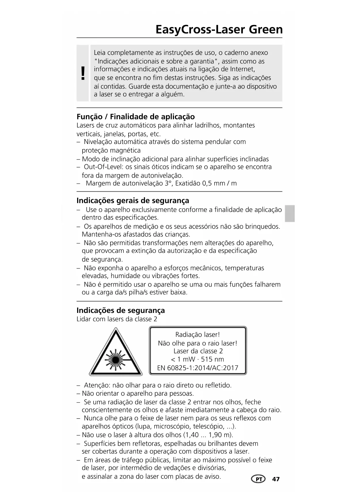 Função / Finalidade de aplicação Lasers de cruz automáticos para alinhar ladrilhos, montantes verticais, janelas, portas, etc. – Nivelação automática através do sistema pendular com proteção magnética – Modo de inclinação adicional para alinhar superfícies inclinadas – Out-Of-Level: os sinais óticos indicam se o aparelho se encontra fora da margem de autonivelação. – Margem de autonivelação 3°, Exatidão 0,5 mm / m – Atenção: não olhar para o raio direto ou reetido. – Não orientar o aparelho para pessoas. – Se uma radiação de laser da classe 2 entrar nos olhos, feche conscientemente os olhos e afaste imediatamente a cabeça do raio. – Nunca olhe para o feixe de laser nem para os seus reexos com aparelhos ópticos (lupa, microscópio, telescópio, ...). – Não use o laser à altura dos olhos (1,40 ... 1,90 m). – Superfícies bem reetoras, espelhadas ou brilhantes devem ser cobertas durante a operação com dispositivos a laser. – Em áreas de tráfego públicas, limitar ao máximo possível o feixe de laser, por intermédio de vedações e divisórias, e assinalar a zona do laser com placas de aviso. Radiação laser! Não olhe para o raio laser! Laser da classe 2 < 1 mW · 515 nm EN 60825-1:2014/AC:2017 Indicações de segurança Lidar com lasers da classe 2 Indicações gerais de segurança – Use o aparelho exclusivamente conforme a nalidade de aplicação dentro das especicações. – Os aparelhos de medição e os seus acessórios não são brinquedos. Mantenha-os afastados das crianças. – Não são permitidas transformações nem alterações do aparelho, que provocam a extinção da autorização e da especicação de segurança. – Não exponha o aparelho a esforços mecânicos, temperaturas elevadas, humidade ou vibrações fortes. – Não é permitido usar o aparelho se uma ou mais funções falharem ou a carga da/s pilha/s estiver baixa. Leia completamente as instruções de uso, o caderno anexo "Indicações adicionais e sobre a garantia", assim como as informações e indicações atuais na ligação de Internet, que se encontra no fim destas instruções. Siga as indicações aí contidas. Guarde esta documentação e junte-a ao dispositivo a laser se o entregar a alguém.