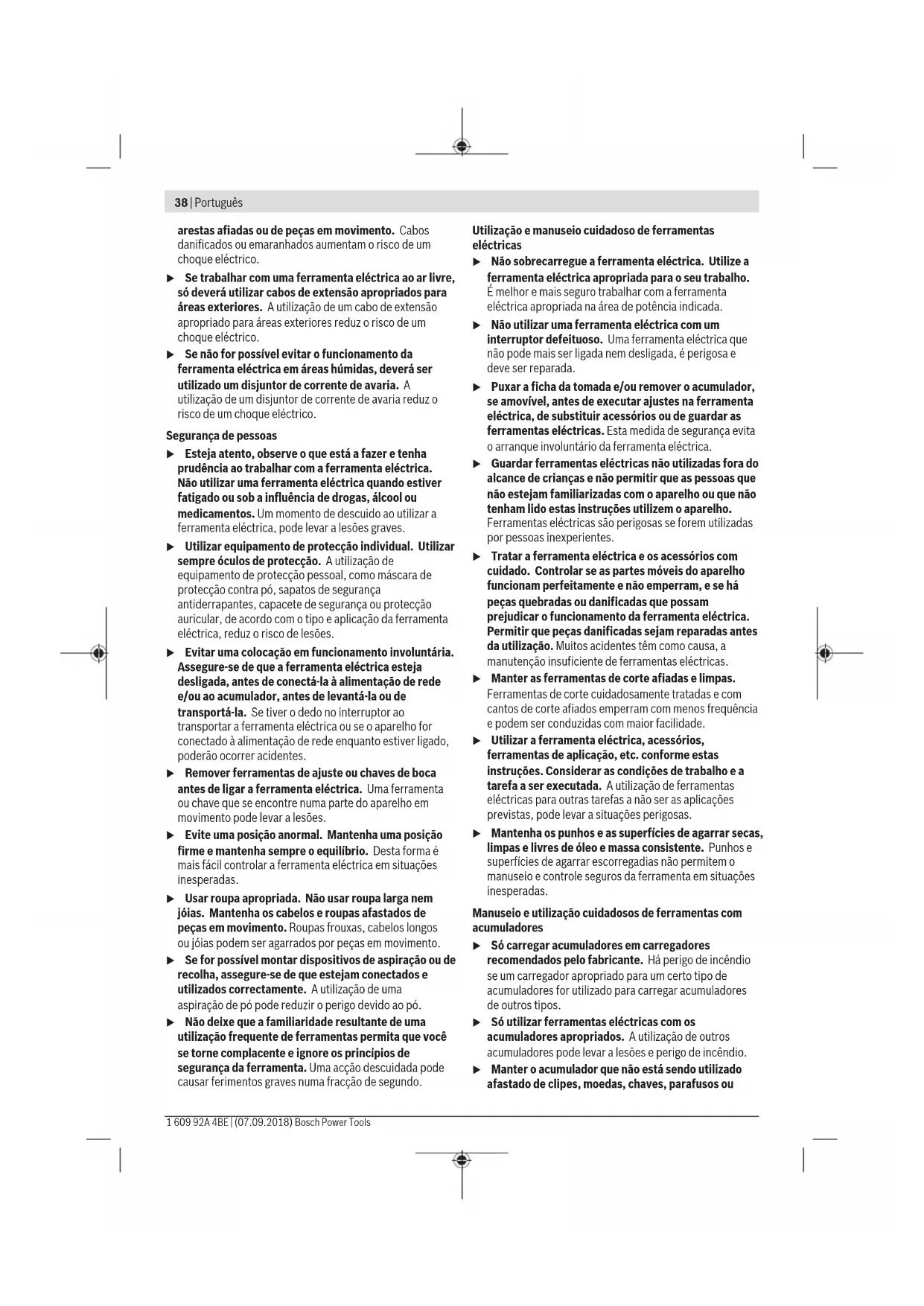O nível de vibrações indicado nestas instruções e o valor de emissões sonoras foram medidos de acordo com um processo de medição normalizado pela norma EN 62841 e podem ser utilizados para a comparação de ferramentas elétricas. Também são adequados para uma avaliação provisória das emissões sonoras e de vibrações. O nível de vibrações indicado e o valor de emissões sonoras representam as aplicações principais da ferramenta elétrica. Se a ferramenta elétrica for utilizada para outras aplicações, com outras ferramentas de trabalho ou com manutenção insuficiente, é possível que o nível de vibrações e de emissões sonoras seja diferente. Isto pode aumentar sensivelmente a emissão sonora e de vibrações para o período completo de trabalho. Para uma estimação exata da emissão sonora e de vibrações, também deveriam ser considerados os períodos nos quais o aparelho está desligado ou funciona, mas não está sendo utilizado. Isto pode reduzir a emissão sonora e de vibrações durante o completo período de trabalho. Além disso também deverão ser estipuladas medidas de segurança para proteger o operador contra o efeito de vibrações, como por exemplo: manutenção de ferramentas elétricas e acessórios, manter as mãos quentes e organização dos processos de trabalho. Montagem Carregar a bateria u Só utilizar os carregadores que constam na página de acessórios. Só estes carregadores são apropriados para os baterias de lítio utilizadas para a sua ferramenta elétrica. Nota: A bateria é fornecida parcialmente carregada. Para assegurar a completa potência da bateria, a bateria deverá ser carregada completamente no carregador antes da primeira utilização. A bateria de lítio pode ser carregada a qualquer altura, sem que a sua vida útil seja reduzida. Uma interrupção do processo de carga não danifica a bateria. O acumulador de iões de lítio está protegido contra descarga completa pelo sistema "Electronic Cell Protection (ECP)". A ferramenta elétrica é desligada através de um disjuntor de proteção, logo que o acumulador estiver descarregado. A ferramenta de trabalho não se movimenta mais. u Não continuar a premir o interruptor de ligar/desligar após o desligamento automático da ferramenta elétrica. A bateria pode ser danificada. Retirar a bateria Para retirar a bateria pressione a tecla de desbloqueio da bateria e puxe a bateria para trás para a retirar da ferramenta elétrica. Não empregar força. Indicador do nível de carga da bateria O indicador do nível de carga da bateria (13) mostra durante alguns segundos o nível de carga da bateria, premindo parcial ou totalmente o interruptor de ligar/desligar (14), e é composto por 3 LEDs verdes. LED Capacidade Luz permanente 3x verde ≥ 66% Luz permanente 2x verde 33 – 66% Luz permanente 1 x verde 11 – 33% Luz intermitente lenta 1 x verde ≤ 10% Os 3 LEDs do indicador do nível de carga piscam rapidamente quando a temperatura da bateria está fora da faixa de temperatura de serviço de –30 até +65°C e/ ou a proteção contra sobrecarga foi ativada. Português | 41 Bosch Power Tools 1 609 92A 4BE | (07.09.2018)42 | Português 1 609 92A 4BE | (07.09.2018) Bosch Power Tools Troca de ferramenta Colocar acessório (ver figura A) Introduza a ferramenta de trabalho até ao batente no encaixe da ferramenta (2). A ferramenta de trabalho é segurada através de um íman no encaixe da ferramenta. Retirar a ferramenta de trabalho Retire a ferramenta de trabalho do encaixe da ferramenta (2). Montar o adaptador (ver figura B) Retirar a ferramenta de trabalho. Insira o adaptador no encaixe da ferramenta (2). O adaptador encaixa de forma audível. Verifique o assento correto, puxando o adaptador. Inserir a ferramenta de trabalho no adaptador (ver figura