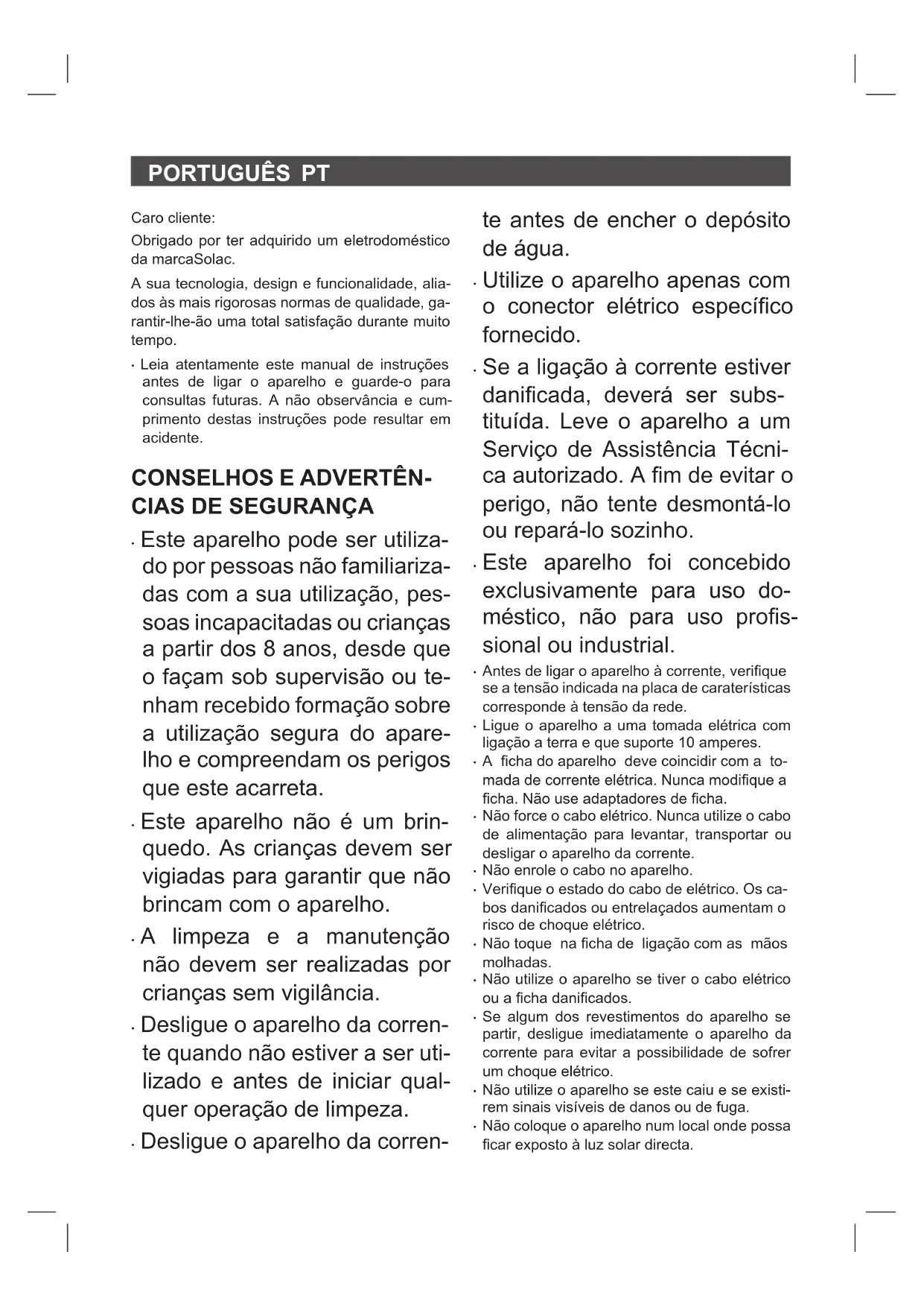 Caro cliente: Obrigado por ter adquirido um eletrodoméstico da marcaSolac. A sua tecnologia, design e funcionalidade, alia- dos às mais rigorosas normas de qualidade, ga- rantir-lhe-ão uma total satisfação durante muito tempo.