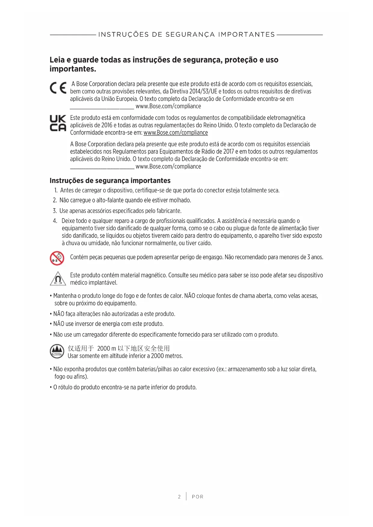 POR Leia e guarde todas as instruções de segurança, proteção e uso importantes. A Bose Corporation declara pela presente que este produto está de acordo com os requisitos essenciais, bemcomo outras provisões relevantes, da Diretiva 2014/53/UE e todos os outros requisitos de diretivas aplicáveis da União Europeia. O texto completo da Declaração de Conformidade encontra-se em www.Bose.com/compliancewww.Bose.com/compliance Este produto está em conformidade com todos os regulamentos de compatibilidade eletromagnética aplicáveis de 2016 e todas as outras regulamentações do Reino Unido. O texto completo da Declaração de Conformidade encontra-se em: www.Bose.com/compliancewww.Bose.com/compliance A Bose Corporation declara pela presente que este produto está de acordo com os requisitos essenciais estabelecidos nos Regulamentos para Equipamentos de Rádio de 2017 e em todos os outros regulamentos aplicáveis do Reino Unido. O texto completo da Declaração de Conformidade encontra-se em: www.Bose.com/compliancewww.Bose.com/compliance Instruções de segurança importantes