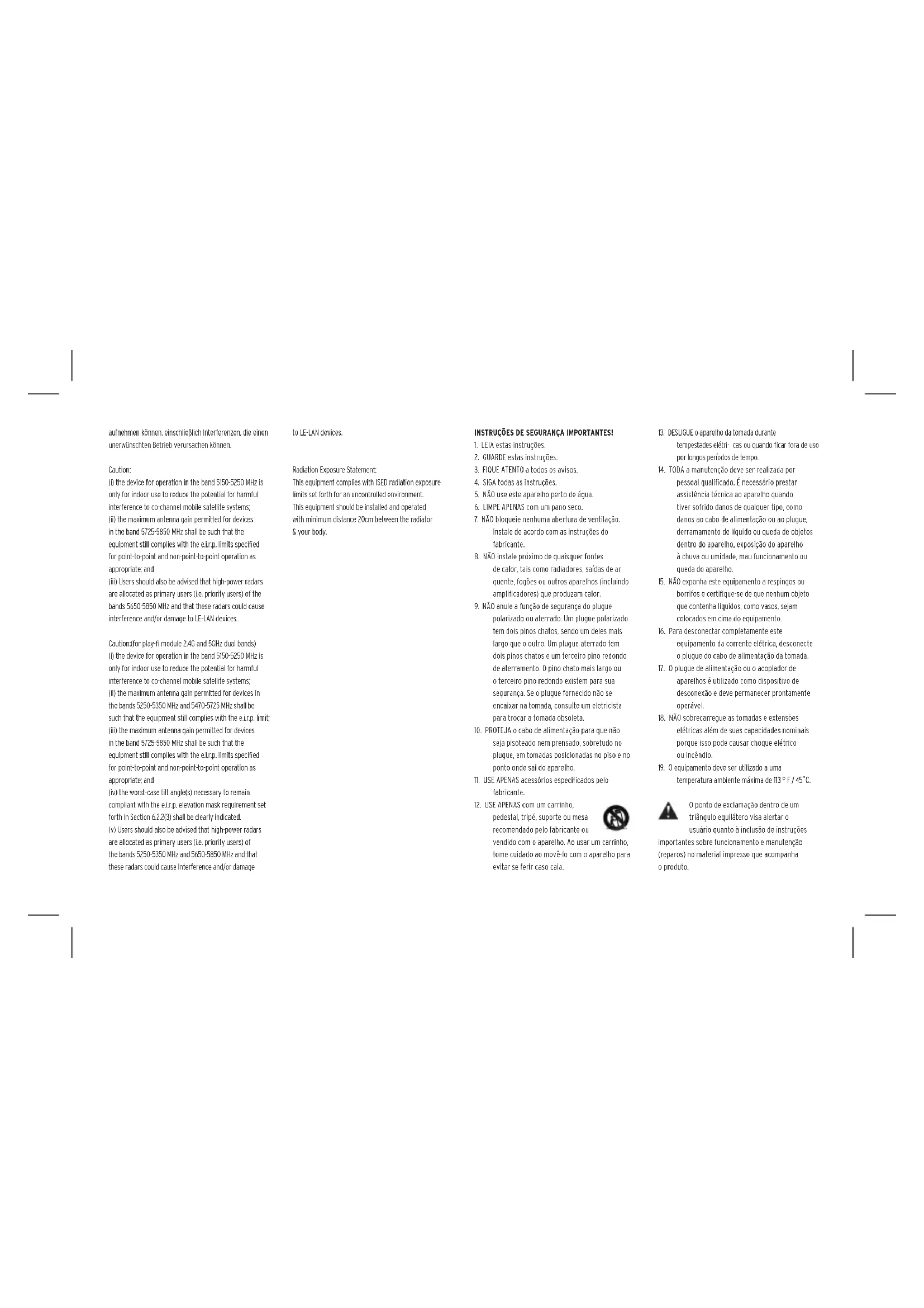 temperatura ambiente máxima de 113 ° F / 45˚C. O ponto de exclamação dentro de um triângulo equilátero visa alertar o usuário quanto à inclusão de instruções importantes sobre funcionamento e manutenção (reparos) no material impresso que acompanha o produto.O símbolo do raio com uma seta, dentro de um triângulo equilátero, visa alertar o usuário quanto à presença de tensão perigosa não isolada dentro do compartimento do produto, que pode ser potente o suciente para representar um risco de choque elétrico às pessoas. ATENÇÃO: Para evitar ferimentos, este aparelho deve ser rmemente xado ao piso/parede de acordo com as instruções de instalação. ATENÇÃO: Para reduzir o risco de incêndio ou choque elétrico, não exponha este aparelho à chuva ou à umidade. ATENÇÃO: Este equipamento é um aparelho elétrico com isolamento duplo, ou Classe II. Foi projetado de tal forma que não requer uma conexão de aterramento para proteção. ATENÇÃO: Nenhuma fonte de chama exposta, como uma vela, deve ser colocada em cima do produto. ESTE PRODUTO CONTÉM UMA BATERIA DE LÍTIO TIPO MOEDA QUE, SE FOR USADA INCORRETAMENTE OU SOFRER ABUSO, PODE CAUSAR: