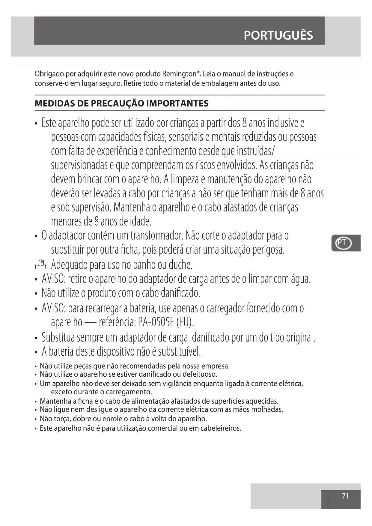 Obrigado por adquirir este novo produto Remington®. Leia o manual de instruções e conserve-o em lugar seguro. Retire todo o material de embalagem antes do uso.