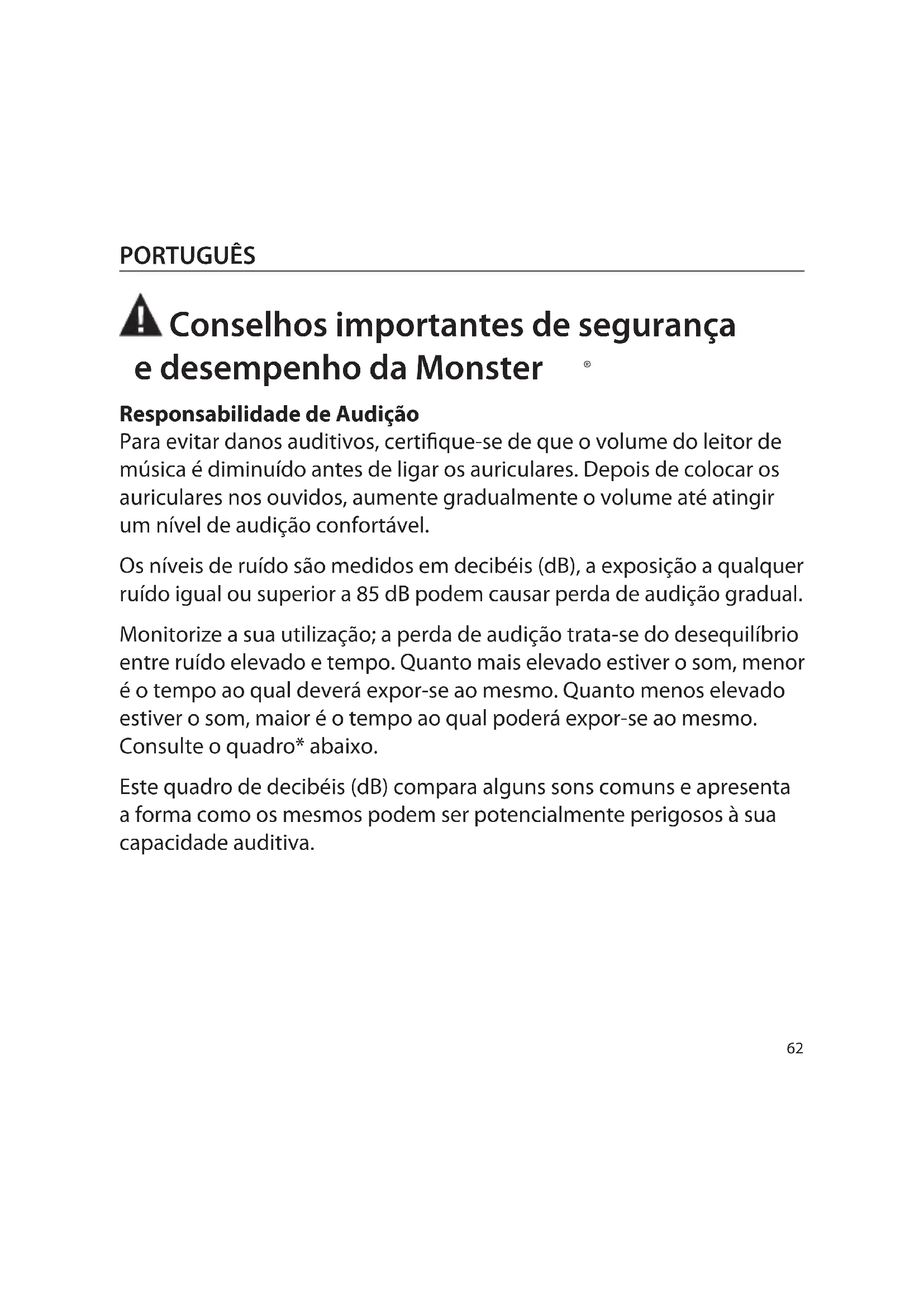 PORTUGUÊSUso Responsável Não utilize os seus auscultadores quando não é seguro fazê-lo - ao conduzir um veículo, a atravessar a estrada ou durante qualquer actividade ou ambiente onde a sua atenção completa àquilo que o rodeia é um factor essencial. É perigoso conduzir enquanto ouve os seus auscultadores e, em inúmeros locais, também é ilegal devido ao facto de diminuir as suas capacidades de escutar sons que lhe podem salvar a vida fora do seu veículo, tais como a buzina de outro veículo e sirenas de veículos de emergência. Evite ouvir os seus auscultadores enquanto conduz. Utilize um dos transmissores FM da Monster para ouvir os seus dispositivos móveis. Aprenda a estabelecer um nível de audição segura e leia outras importantes directrizes de segurança da Associação de Dispositivos Electrónicos para o Consumidor em www.ce.org e da Fundação de Pesquisa da Perda Auditiva em www.drf.org.