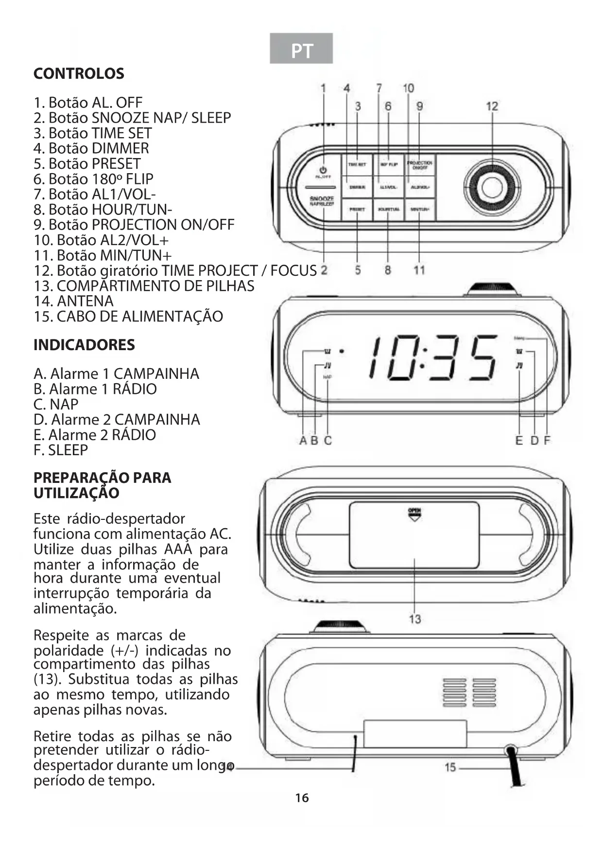 UTILIZAÇÃO Este rádio-despertador funciona com alimentação AC. Utilize duas pilhas AAA para manter a informação de hora durante uma eventual interrupção temporária da alimentação. Respeite as marcas de polaridade (+/-) indicadas no compartimento das pilhas (13). Substitua todas as pilhas ao mesmo tempo, utilizando apenas pilhas novas. Retire todas as pilhas se não pretender utilizar o rádio- despertador durante um longo período de tempo.PT