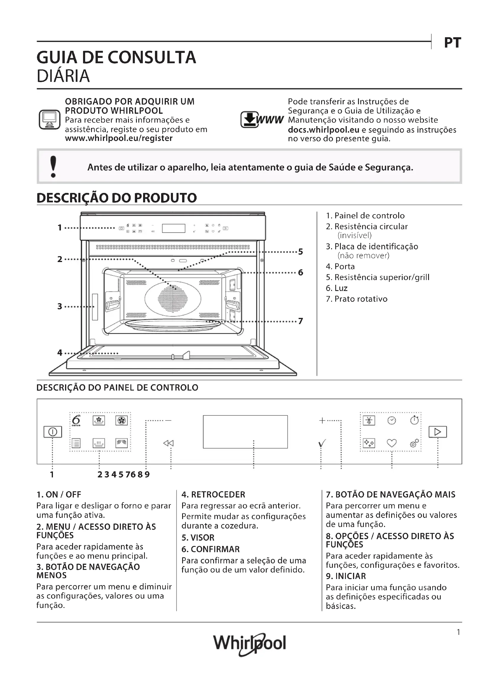 DIÁRIA OBRIGADO POR ADQUIRIR UM PRODUTO WHIRLPOOLPara receber mais informações e assistência, registe o seu produto em www . whirlpool . eu/ register WWW Pode transferir as Instruções de Segurança e o Guia de Utilização e Manutenção visitando o nosso website docs . whirlpool . eu e seguindo as instruções no verso do presente guia. Antes de utilizar o aparelho, leia atentamente o guia de Saúde e Segurança.