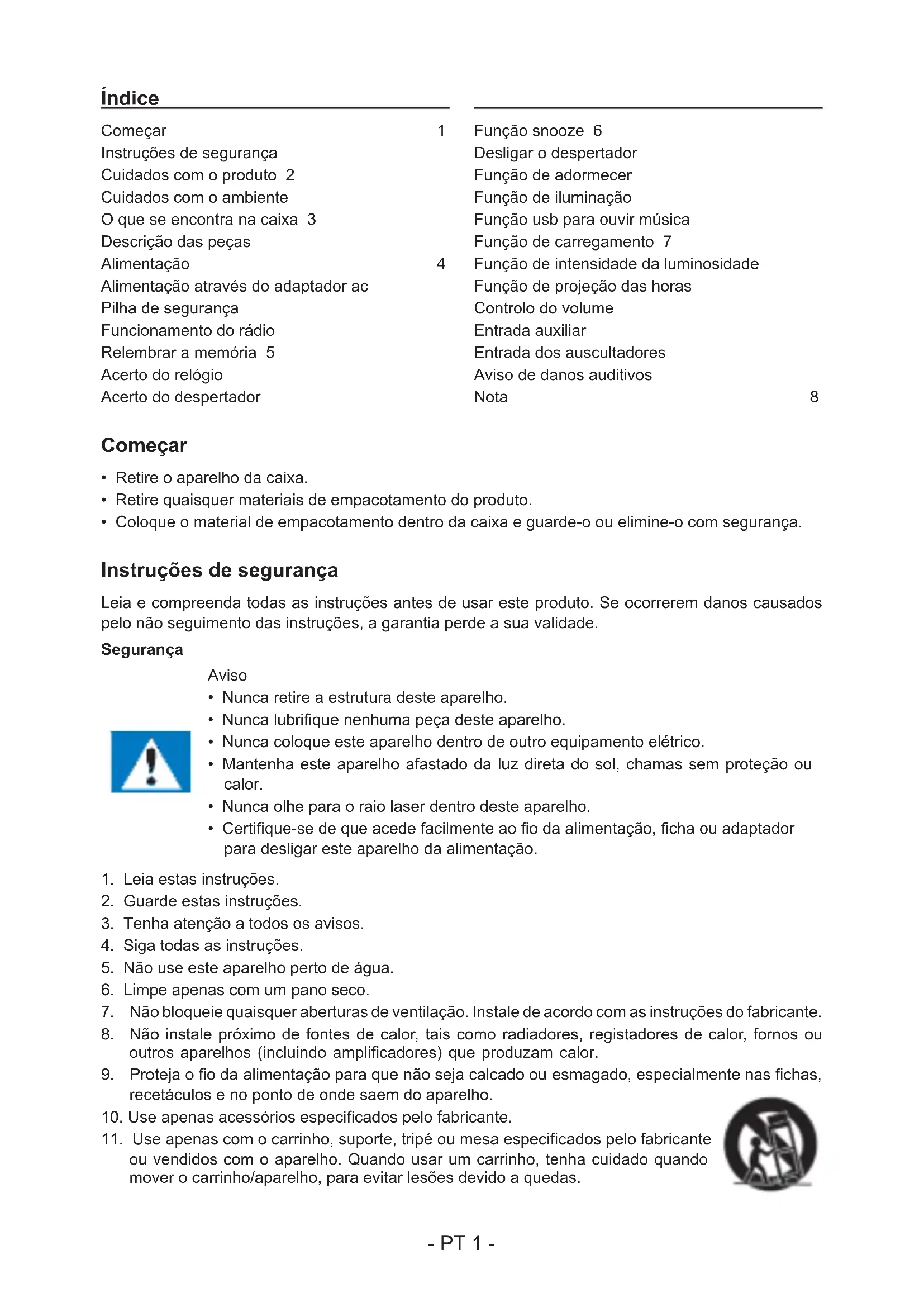 LEIA TODO O MANUAL DE UTILIZADOR ANTES DE TRABALHAR COM ESTA UNIDADE E GUARDE O FOLHETO PARA REFERÊNCIA FUTURA. PT- PT 1 - Índice Começar 1 Instruções de segurança Cuidados com o produto 2 Cuidados com o ambiente O que se encontra na caixa 3 Descrição das peças Alimentação 4 Alimentação através do adaptador ac Pilha de segurança Funcionamento do rádio Relembrar a memória 5 Acerto do relógio Acerto do despertador Função snooze 6 Desligar o despertador Função de adormecer Função de iluminação Função usb para ouvir música Função de carregamento 7 Função de intensidade da luminosidade Função de projeção das horas Controlo do volume Entrada auxiliar Entrada dos auscultadores Aviso de danos auditivos Nota 8 Começar