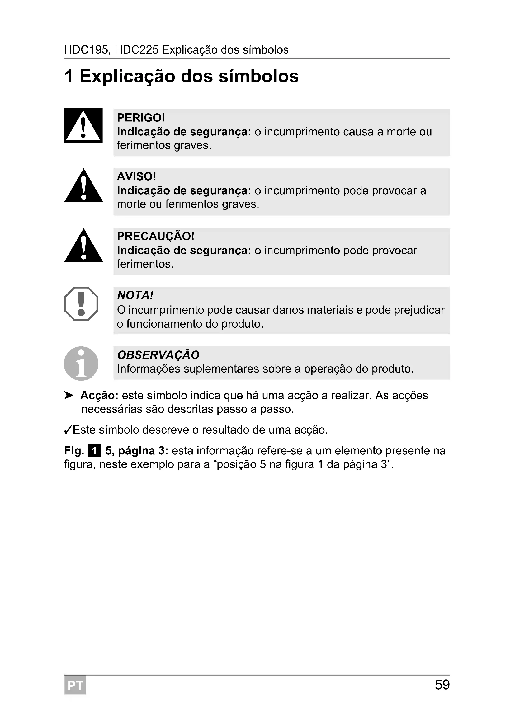 ➤ Acção: este símbolo indica que há uma acção a realizar. As acções necessárias são descritas passo a passo. ✓ Este símbolo descreve o resultado de uma acção. Fig. 1 5, página 3: esta informação refere-se a um elemento presente na figura, neste exemplo para a “posição 5 na figura 1 da página 3”. PERIGO! Indicação de segurança: o incumprimento causa a morte ou ferimentos graves. AVISO! Indicação de segurança: o incumprimento pode provocar a morte ou ferimentos graves. PRECAUÇÃO! Indicação de segurança: o incumprimento pode provocar ferimentos. NOTA! O incumprimento pode causar danos materiais e pode prejudicar o funcionamento do produto. OBSERVAÇÃO Informações suplementares sobre a operação do produto.PT Indicações de segurança HDC195, HDC225