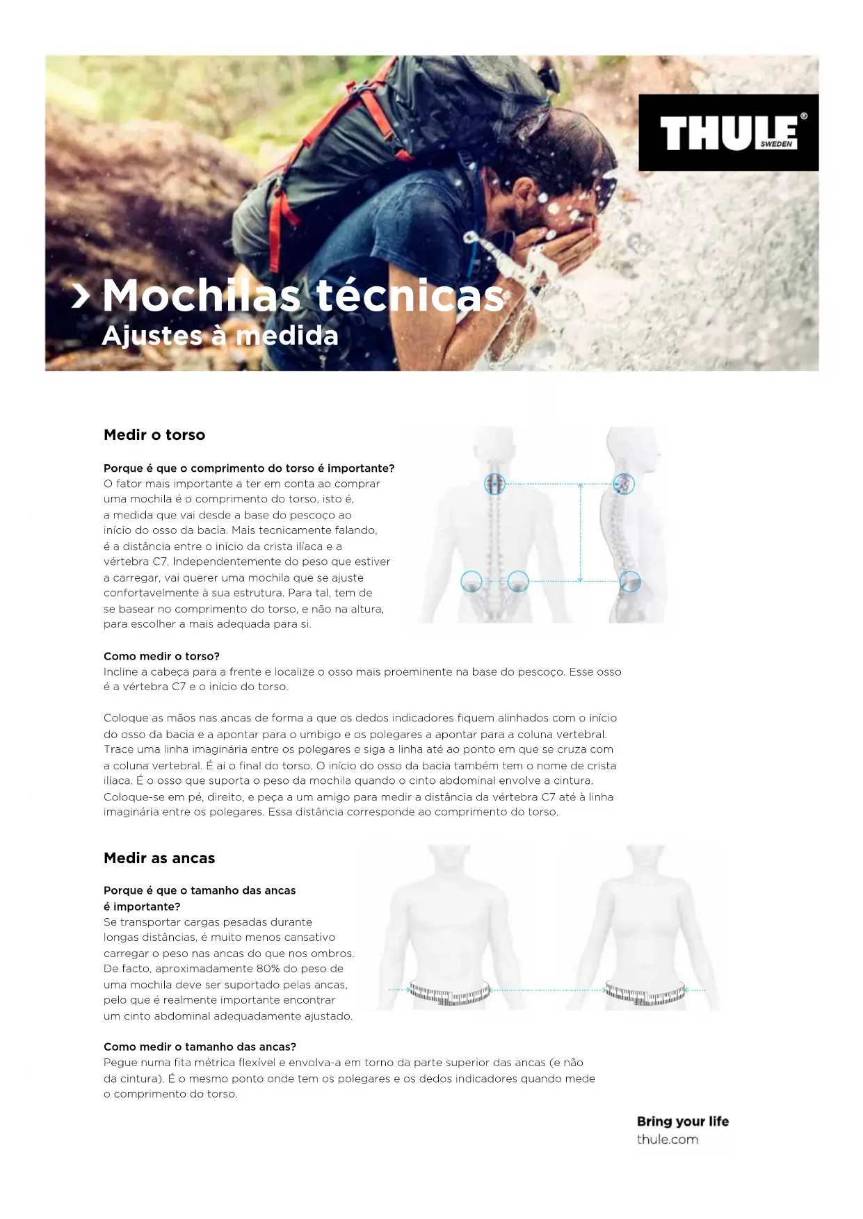 вещи следует располагать в верхней части рюкзака или в его наружных карманах. Light Items Heavy Items Light Items Heavy ItemsMochilas técnicas Ajustes à medida Medir o torso Porque é que o comprimento do torso é importante? O fator mais importante a ter em conta ao comprar uma mochila é o comprimento do torso, isto é, amedida que vai desde a base do pescoço ao início do osso da bacia. Mais tecnicamente falando, éadistância entre o início da crista ilíaca e a vértebra C7. Independentemente do peso que estiver acarregar, vai querer uma mochila que se ajuste confortavelmente à sua estrutura. Para tal, tem de sebasear no comprimento do torso, e não na altura, para escolher a mais adequada para si. Como medir o torso?Incline a cabeça para a frente e localize o osso mais proeminente na base do pescoço. Esse osso éa vértebra C7 e o início do torso.Coloque as mãos nas ancas de forma a que os dedos indicadores fiquem alinhados com o início doosso da bacia e a apontar para o umbigo e os polegares a apontar para a coluna vertebral. Trace uma linha imaginária entre os polegares e siga a linha até ao ponto em que se cruza com a coluna vertebral. É aí o final do torso. O início do osso da bacia também tem o nome de crista ilíaca. É o osso que suporta o peso da mochila quando o cinto abdominal envolve a cintura. Coloque-se em pé, direito, e peça a um amigo para medir a distância da vértebra C7 até à linha imaginária entre os polegares. Essa distância corresponde ao comprimento do torso. Medir as ancas Porque é que o tamanho das ancas éimportante? Se transportar cargas pesadas durante longas distâncias, é muito menos cansativo carregar opeso nas ancas do que nos ombros. Defacto,aproximadamente 80% do peso de uma mochila deve ser suportado pelas ancas, pelo que é realmente importante encontrar umcinto abdominal adequadamente ajustado.Como medir o tamanho das ancas?Pegue numa fita métrica flexível e envolva-a em torno da parte superior das ancas (e não da cintura). É o mesmo ponto onde tem os polegares e os dedos indicadores quando mede ocomprimento do torso. INCH
