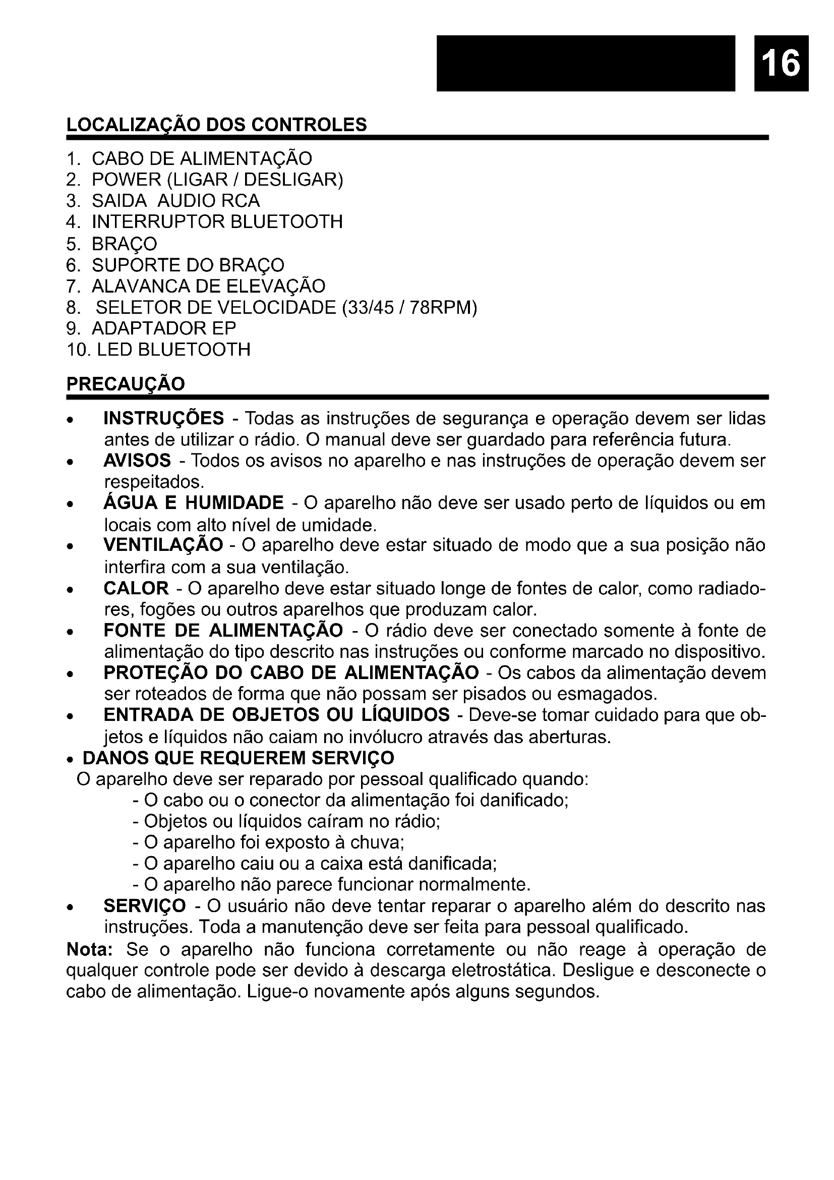 PRECAUÇÃO INSTRUÇÕES - Todas as instruções de segurança e operação devem ser lidas antes de utilizar o rádio. O manual deve ser guardado para referência futura. AVISOS - Todos os avisos no aparelho e nas instruções de operação devem ser respeitados. ÁGUA E HUMIDADE - O aparelho não deve ser usado perto de líquidos ou em locais com alto nível de umidade. VENTILAÇÃO - O aparelho deve estar situado de modo que a sua posição não interfira com a sua ventilação. CALOR - O aparelho deve estar situado longe de fontes de calor, como radiado- res, fogões ou outros aparelhos que produzam calor. FONTE DE ALIMENTAÇÃO - O rádio deve ser conectado somente à fonte de alimentação do tipo descrito nas instruções ou conforme marcado no dispositivo. PROTEÇÃO DO CABO DE ALIMENTAÇÃO - Os cabos da alimentação devem ser roteados de forma que não possam ser pisados ou esmagados. ENTRADA DE OBJETOS OU LÍQUIDOS - Deve-se tomar cuidado para que ob- jetos e líquidos não caiam no invólucro através das aberturas.