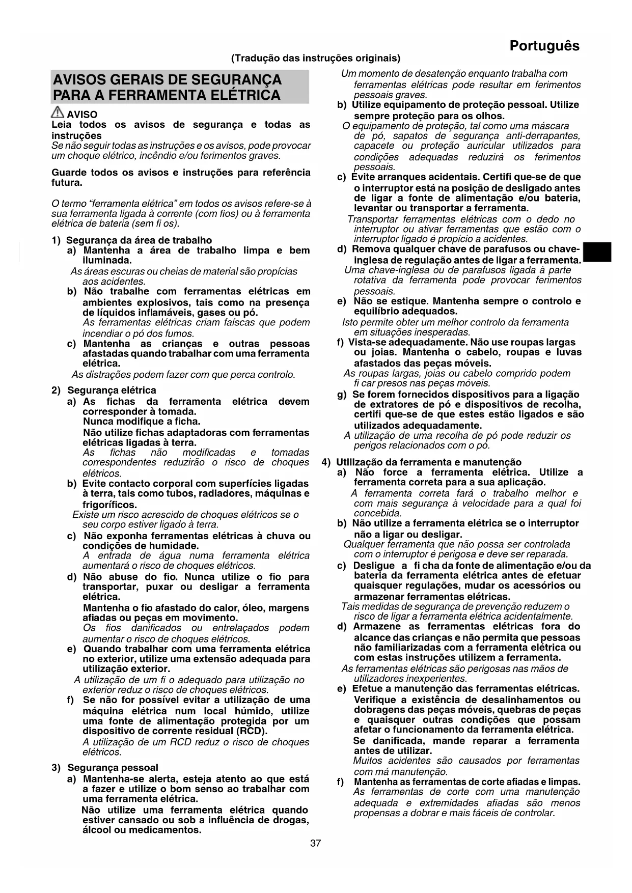a) Mantenha-se alerta, esteja atento ao que está a fazer e utilize o bom senso ao trabalhar com uma ferramenta elétrica. Não utilize uma ferramenta elétrica quando estiver cansado ou sob a infl uência de drogas, álcool ou medicamentos. (Tradução das instruções originais) 0000BookG10SS2.indb370000BookG10SS2.indb37 2017/12/0413:45:032017/12/0413:45:0338 Português