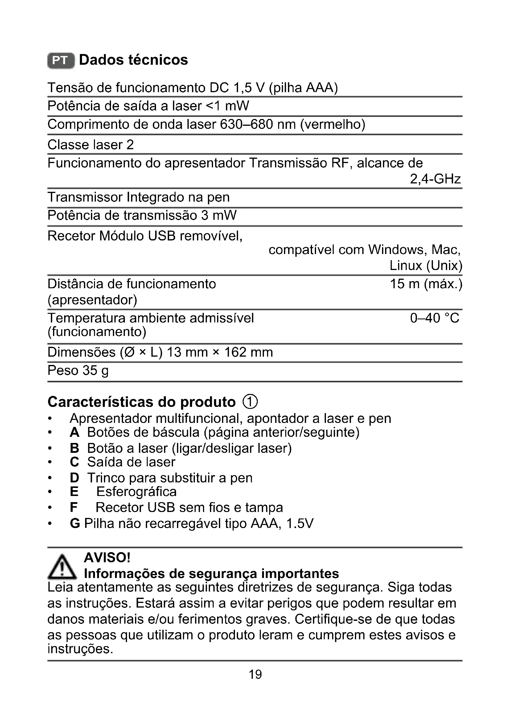 Dados técnicos Tensão de funcionamento DC 1,5 V (pilha AAA) Potência de saída a laser <1 mW Comprimento de onda laser 630–680 nm (vermelho) Classe laser 2 Funcionamento do apresentador Transmissão RF, alcance de 2,4-GHz Transmissor Integrado na pen Potência de transmissão 3 mW Recetor Módulo USB removível, compatível com Windows, Mac, Linux (Unix) Distância de funcionamento (apresentador) 15 m (máx.) Temperatura ambiente admissível (funcionamento) 0–40 °C Dimensões (Ø × L) 13 mm × 162 mm Peso 35 g Características do produto
