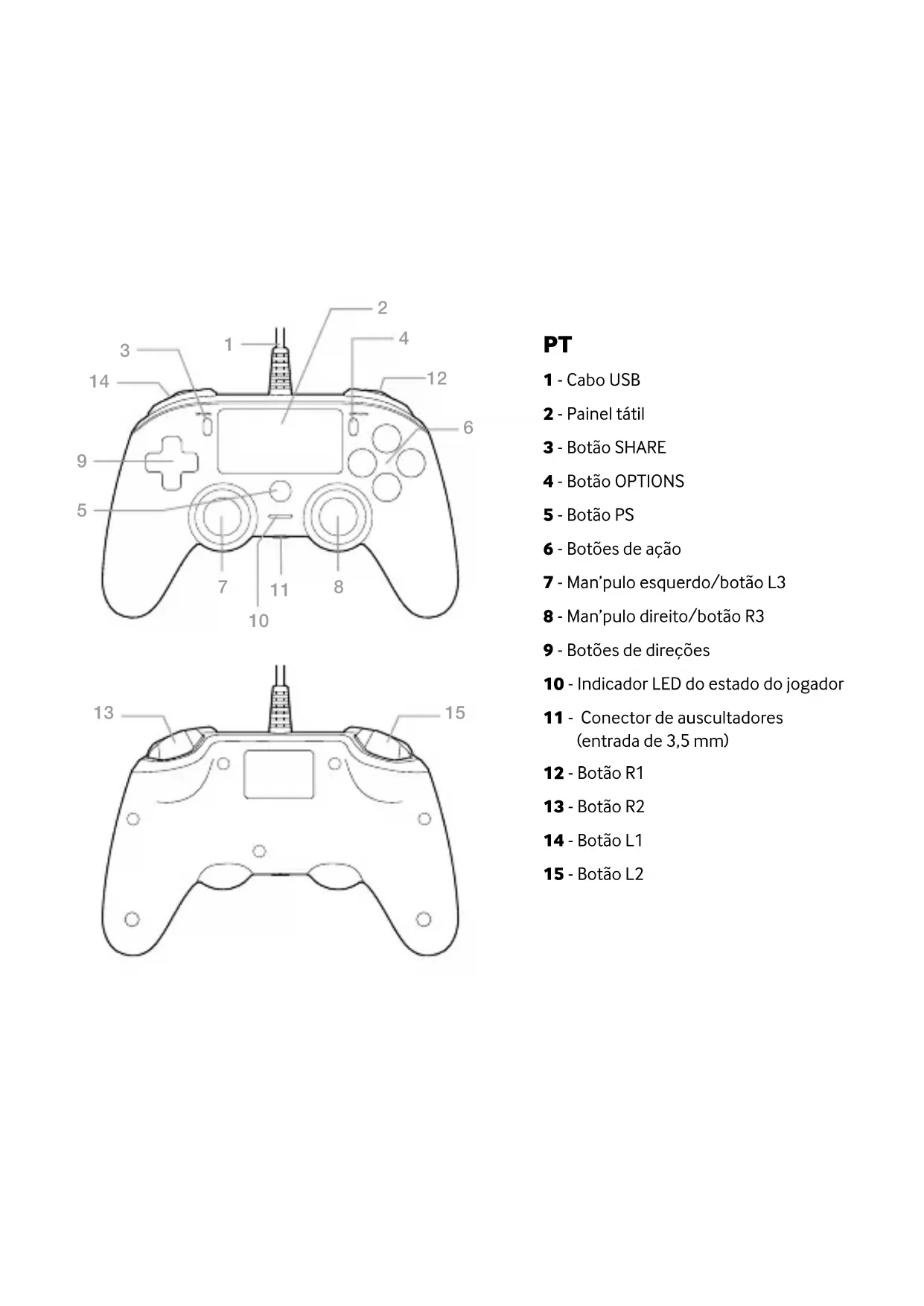 Obrigado por comprares o produto WIRED COMPACT CONTROLLER da NACON para PS4™. Este produto foi criado para otimizar a tua experiência de jogo. Mantém este manual de instruções para referência futura. Se precisares de assistência ou ajuda, contacta o apoio técnico. GARANTIA Este produto com a marca comercial da NACON possui garantia do fabricante pelo período de 2 anos a partir da data da compra, e será, durante este período, substituído por um modelo igual ou semelhante, à nossa escolha, sem custos, no caso de existir um defeito de material ou de fabrico. Esta garantia não cobre defeitos originados por danos acidentais, uso indevido ou desgaste e está disponível apenas para o comprador original do produto. Estes termos não afetam os teus direitos previstos pela lei. UTILIZAÇÃO Liga a cha USB do teu WIRED COMPACT CONTROLLER a uma das portas livres da tua consola. Aviso: Este comando não suporta as seguintes funcionalidades do comando sem os DUALSHOCK®4: altifalante integrado, barra de luz e sensor de movimento SIXAXIS™. Poderão ser colocadas atualizações de rmware no nosso website www.nacongaming.com para melhorar a funcionalidade deste produto. Visita este website com frequência. Este comando também pode ser usado com jogos em ambiente de Windows® PC
