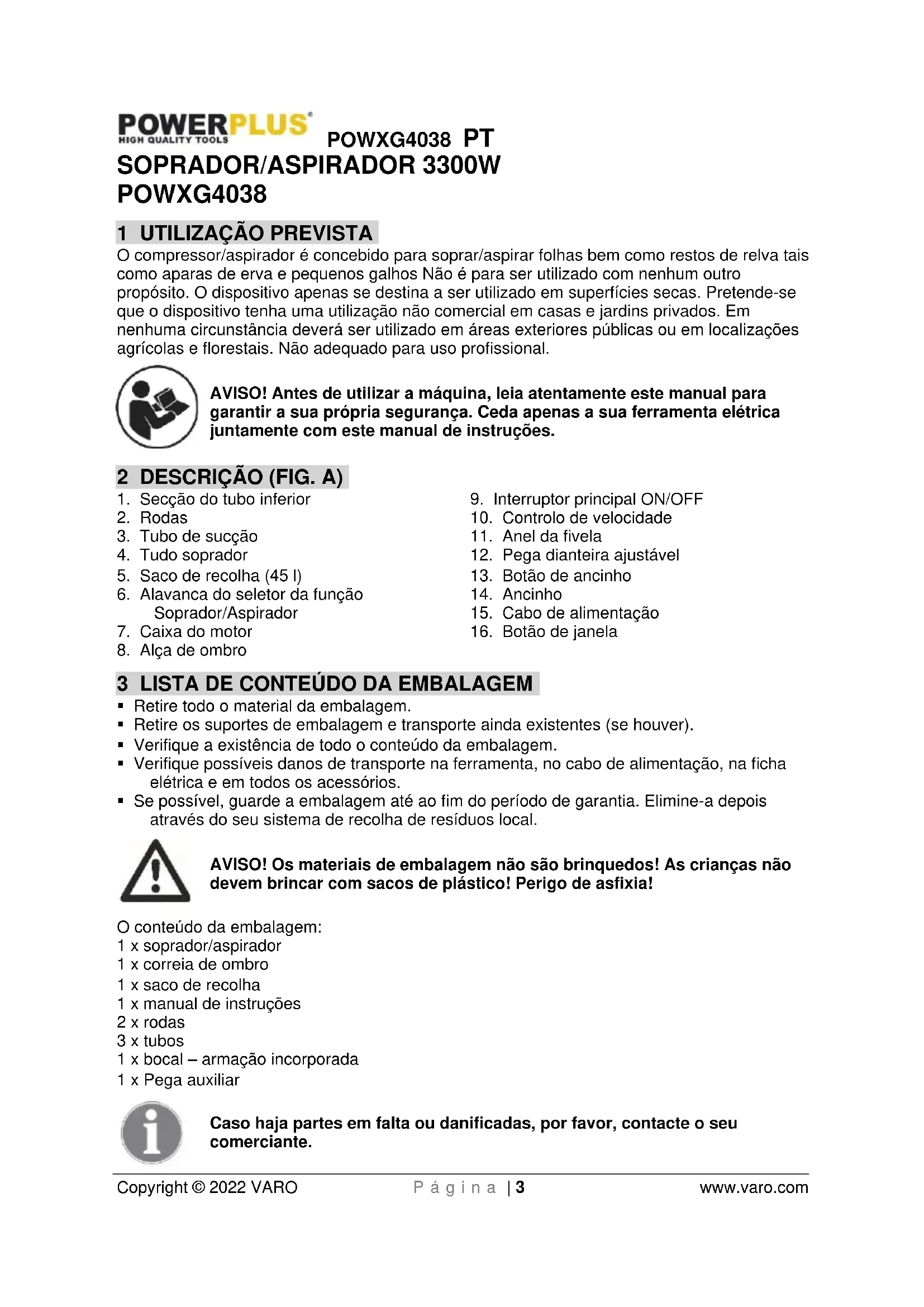 - Se possível, guarde a embalagem até ao fim do período de garantia. Elimine-a depois através do seu sistema de recolha de resíduos local. AVISO! Os materiais de embalagem não são brinquedos! As crianças não devem brincar com sacos de plástico! Perigo de asfixia! O conteúdo da embalagem: 1 x soprador/aspirador 1 x correia de ombro 1 x saco de recolha 1 x manual de instruções 2 x rodas 3 x tubos 1 x bocal – armação incorporada 1 x Pega auxiliar Caso haja partes em falta ou danificadas, por favor, contacte o seu comerciante.POWXG4038 PT Copyright © 2022 VARO P á g i n a | 4 www.varo.com 4 SÍMBOLOS Neste manual e/ou na máquina são utilizados os seguintes símbolos: