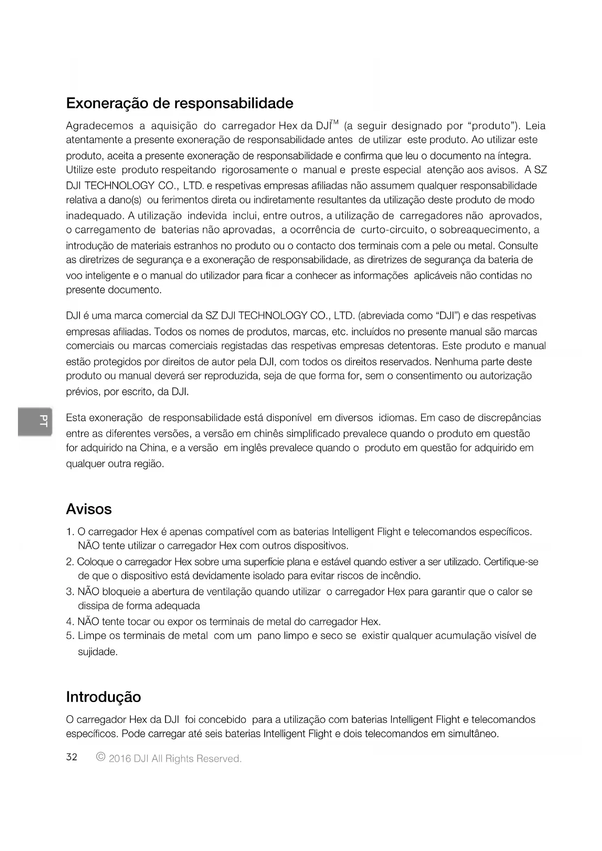e respetivas empresas aliadas não assumem qualquer responsabilidade relativa a dano(s) ou ferimentos direta ou indiretamente resultantes da utilização deste produto de modo inadequado. A utilização indevida inclui, entre outros, a utilização de carregadores não aprovados, o carregamento de baterias não aprovadas, a ocorrência de curto-circuito, o sobreaquecimento, a introdução de materiais estranhos no produto ou o contacto dos terminais com a pele ou metal. Consulte as diretrizes de segurança e a exoneração de responsabilidade, as diretrizes de segurança da bateria de voo inteligente e o manual do utilizador para car a conhecer as informações aplicáveis não contidas no presente documento. DJI é uma marca comercial da SZ DJI TECHNOLOGY CO., LTD. (abreviada como “DJI”) e das respetivas empresas aliadas. Todos os nomes de produtos, marcas, etc. incluídos no presente manual são marcas comerciais ou marcas comerciais registadas das respetivas empresas detentoras. Este produto e manual estão protegidos por direitos de autor pela DJI, com todos os direitos reservados. Nenhuma parte deste produto ou manual deverá ser reproduzida, seja de que forma for, sem o consentimento ou autorização prévios, por escrito, da DJI. Esta exoneração de responsabilidade está disponível em diversos idiomas. Em caso de discrepâncias entre as diferentes versões, a versão em chinês simplicado prevalece quando o produto em questão for adquirido na China, e a versão em inglês prevalece quando o produto em questão for adquirido em qualquer outra região. Avisos
