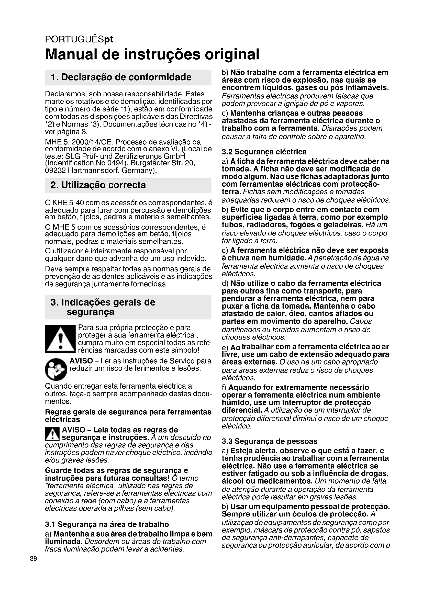 Manual de instruções original Declaramos, sob nossa responsabilidade: Estes martelos rotativos e de demolição, identificadas por tipo e número de série *1), estão em conformidade com todas as disposições aplicáveis das Directivas *2) e Normas *3). Documentações técnicas no *4) - ver página 3. MHE 5: 2000/14/CE: Processo de avaliação da conformidade de acordo com o anexo VI. (Local de teste: SLG Prüf- und Zertifizierungs GmbH (Indentification No 0494), Burgstädter Str. 20, 09232 Hartmannsdorf, Germany). O KHE 5-40 com os acessórios correspondentes, é adequado para furar com percussão e demolições em betão, tijolos, pedras e materiais semelhantes. O MHE 5 com os acessórios correspondentes, é adequado para demolições em betão, tijolos normais, pedras e materiais semelhantes. O utilizador é inteiramente responsável por qualquer dano que advenha de um uso indevido. Deve sempre respeitar todas as normas gerais de prevenção de acidentes aplicáveis e as indicações de segurança juntamente fornecidas. Para sua própria protecção e para proteger a sua ferramenta eléctrica , cumpra muito em especial todas as refe- rências marcadas com este símbolo! AVISO – Ler as Instruções de Serviço para reduzir um risco de ferimentos e lesões. Quando entregar esta ferramenta eléctrica a outros, faça-o sempre acompanhado destes docu- mentos. Regras gerais de segurança para ferramentas eléctricas AVISO – Leia todas as regras de segurança e instruções. A um descuido no cumprimento das regras de segurança e das instruções podem haver choque eléctrico, incêndio e/ou graves lesões. Guarde todas as regras de segurança e instruções para futuras consultas! O termo "ferramenta eléctrica" utilizado nas regras de segurança, refere-se a ferramentas eléctricas com conexão a rede (com cabo) e a ferramentas eléctricas operada a pilhas (sem cabo).