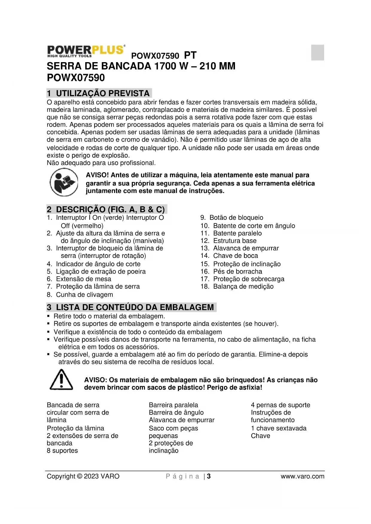 - Se possível, guarde a embalagem até ao fim do período de garantia. Elimine-a depois através do seu sistema de recolha de resíduos local. AVISO: Os materiais de embalagem não são brinquedos! As crianças não devem brincar com sacos de plástico! Perigo de asfixia! Bancada de serra circular com serra de lâmina Proteção da lâmina 2 extensões de serra de bancada 8 suportes Barreira paralela Barreira de ângulo Alavanca de empurrar Saco com peças pequenas 2 proteções de inclinação 4 pernas de suporte Instruções de funcionamento 1 chave sextavada ChavePOWX07590 PT Copyright © 2023 VARO P á g i n a | 4 www.varo.com Caso haja partes em falta ou danificadas, por favor, contacte o seu comerciante. 4 SÍMBOLOS Neste manual e/ou na máquina são utilizados os seguintes símbolos: