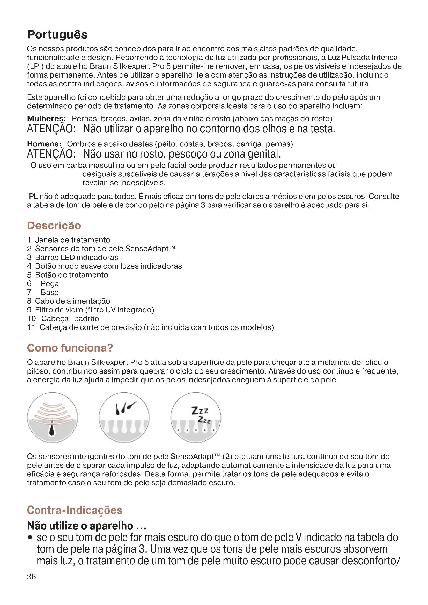 em pelos faciais/na barba no caso dos homens. 91816146_Victoria_Pro5_Euro_01.indd 3791816146_Victoria_Pro5_Euro_01.indd 37 28.06.18 14:4928.06.18 14:49 Business Use - P&G AUTHORIZED POA-00053643 Rev 001 Effective Date 2018-07-02 Printed 2018-07-25 Page 37 of 9438 Não olhe diretamente para o filtro de vidro (9) nem tente ativar o aparelho voltando-o na direção dos olhos. Para proteger os seus olhos e os das pessoas que estejam junto de si, o aparelho só se ativará quando os sensores do tom de pele estiverem em contacto com a pele. Se o aparelho se ativar quando os sensores NÃO estiverem em contacto com a pele, PARE o tratamento de imediato e contacte o seu revendedor. Não utilize mais do que uma vez por semana na mesma área. Isso não acelerará os resultados e pode aumentar as probabilidades de lesão na sua pele. Precauções