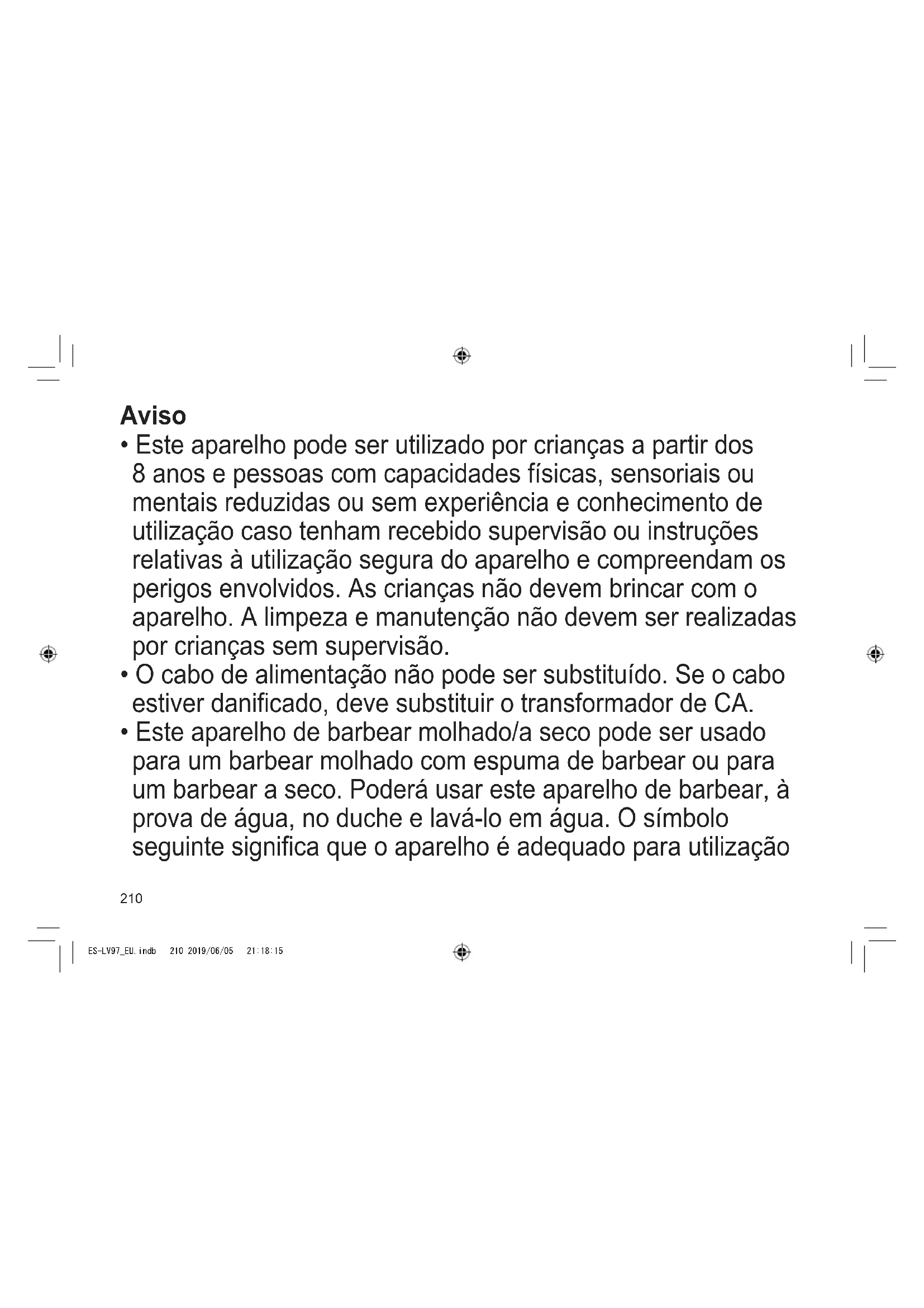 - Este aparelho de barbear molhado/a seco pode ser usado para um barbear molhado com espuma de barbear ou para um barbear a seco. Poderá usar este aparelho de barbear, à prova de água, no duche e lavá‑lo em água. O símbolo seguinte signica que o aparelho é adequado para utilização ES-LV97_EU.indb 210 2019/06/05 21:18:15211 TR RO H SK CZ PL FIN S N P DK E NL I F D GB no banho ou no duche.